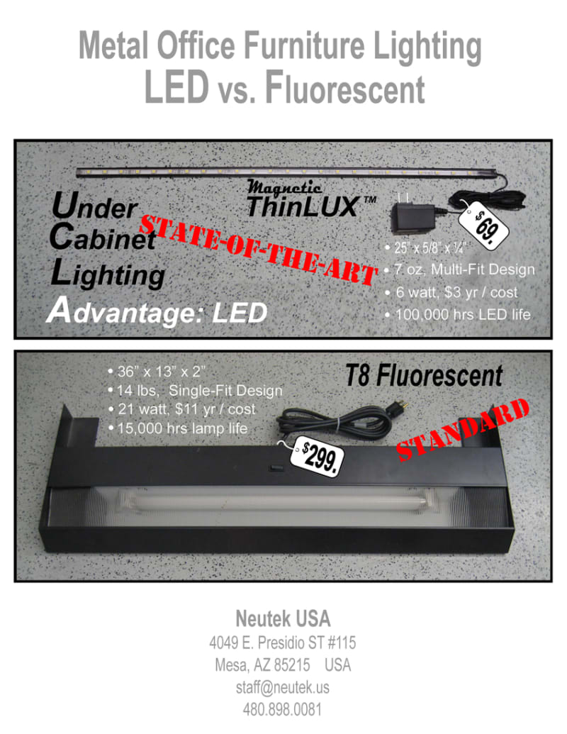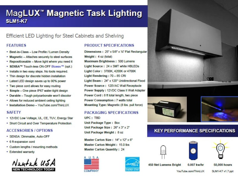 Neutek USA announces all new "Best-In-Class" MagLUX™ SLM1-K7 24" LED Magnetic Task Lighting. MagLUX™ more universally known as ThinLUX™ is designed especially for most common steel cabinets, boxes, enclosures and shelving (e.g. Modular Metal Office Furniture). It's USA manufactured design fully replaces a typical OEM 15+ lb heavy steel fluorescent fixture costing hundreds more. Since it is magnetic and not reliant on custom fit per fixture, one size often is usable across many platforms. Understanding the longevity of an LED design, this universal fit can be re-applied over and over when a business changes furniture or layout.