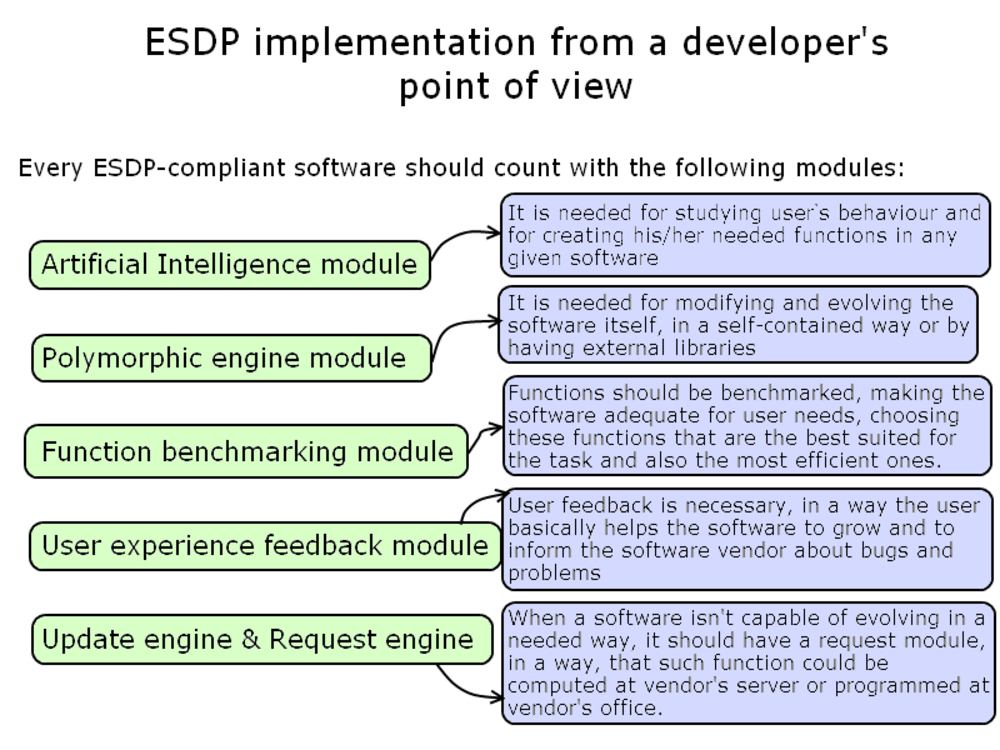 Evolutive Software Design Paradigm (ESDP) is a paradigm of software creation backed up by the Artificial Intelligence field. What is it about this idea? It is simple, software that is capable to learn with user's experience using it ("learn" as in enhancing functions by itself, or even create new ones). This software must count with an AI engine that lets the software to grow in a certain way the user wants. The software must be capable of analyzing the situation (the "needs") and should be capable of writing the code for providing the solution, without vendor's intervention. This makes this kind of software cost-effective to use, because the user wouldn't have much need of querying the vendor about a certain functionality, providing that the software is able to compute it.