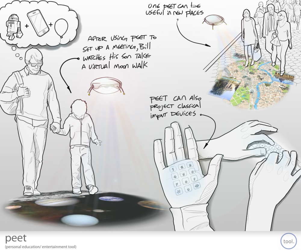 PEET is a new take on the future of computer form factors. We loved the idea of projected surface computing wherein computers of the future can recognize and change accordingly based on their surroundings. However we were unimpressed with the obvious and often blogged about idea of wearing a projector on the body.