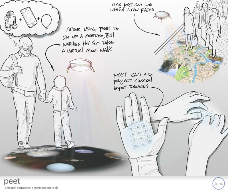 PEET is a small Mylar balloon containing a miniature computer with the ability to project interactive images. PEET can serve as tool or toy from being your personal city tour guide to playing a game of virtual volleyball.