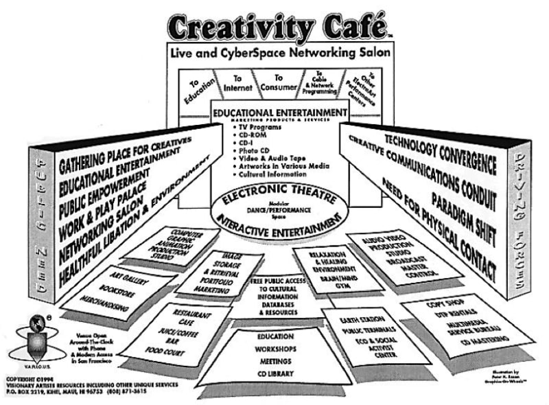 By artists and edutainers teaching in creative, fun and friendly ways, the general public, in any given culture-community-neighborhood, people will easily make new friends, business connections and benefit from the venue operating system. No other nightclub/day club/school today is open to the general public 24/7 with programming designed to harness creativity for social change. Creativity Cafe is a safe “clubhouse.” Kids are protected from undesirable influences.