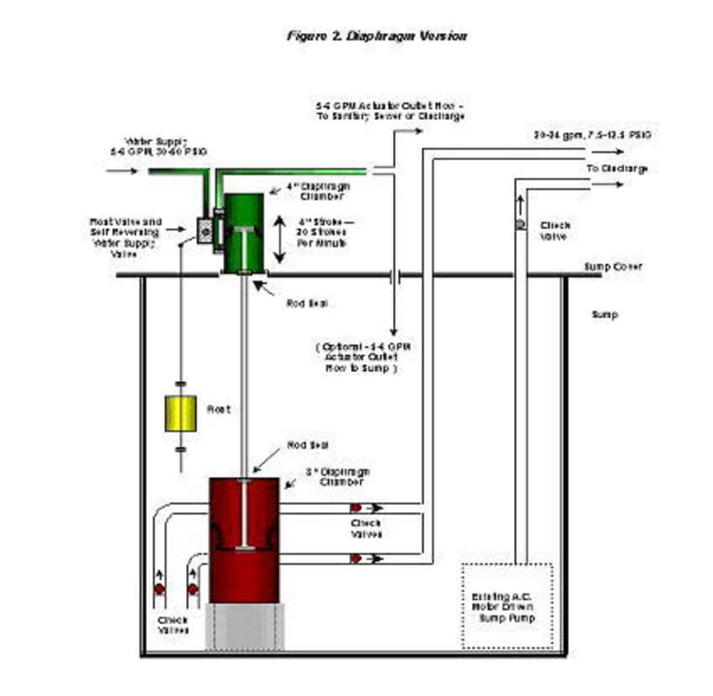 This invention addresses the $ 1 Billion USD annual storm water back up damage to finished basements and below grade construction that occurs during power outages when the AC pump cannot operate and DC battery back up pumps are unable to operate for long durations (usually 1-3 hours of pumping on battery power). Even during harsh storm conditions, however, municipal water supplies continue to flow through pipes separate from those that drain storm water . This invention makes use of the power available from a continuous 30-50psig water supply pressure to run a sump pump that can produce approximately 17-29 feet of head -- more than the 10-12 feet required in most basement applications. The typical 5-6 gallon-per-minute flow rate into the upper actuator results in a 20-24 gallon-per-minute gross discharge flow rate from the lower pump chamber. Such a water-driven water pump can assure that storm water does not back up into below-grade building spaces during power outages of any duration.