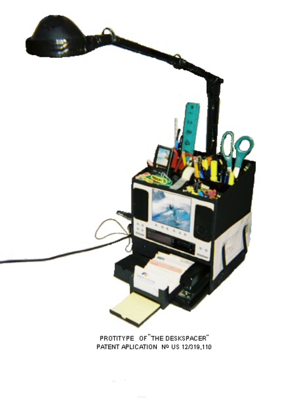 The DeskSpacer II is a quadrilateral shaped utility desk organizer constructed of high-impact durable, lightweight injection molded plastic with a thickness of 16th -18th of an inch, a 10° to 15° slope on the top, a height (front slope) of 8.5 inches, a (back slope) height of 10 inches, a width of 8.5 inches, that combines and integrates all the basic desk accessories, such as Knick/Knacks/Accessories Compartments, Collapsible/Telescopic Lamp, Tape Dispenser, Digital/Analog Clock Radio with Speakers and LED Light Display, Photo Displayer, iPod/ Earphone Docking and Hook-Up, Pencil Sharpener (with Shavings‘ drawer), Business Cards Drawer, Sticky Notepad Tray, Stapler, and Mail/Envelope Holder, into one compact receptacle for the purpose of providing efficiency in the workplace.