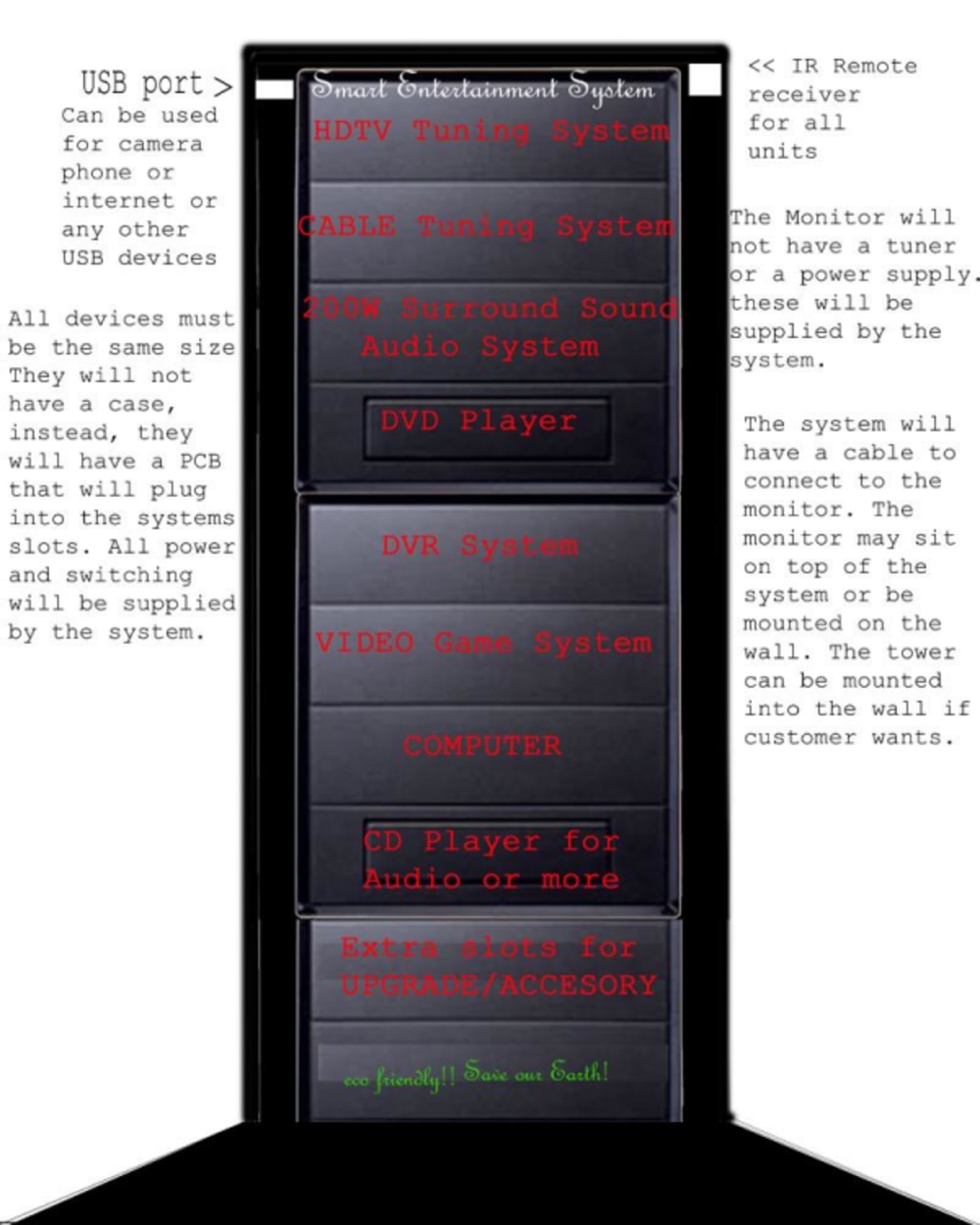 Following is a physical description of the Green Smart Entertainment System, designed to properly characterize the working functions of the product as well as define its physical appearance. The Green Smart Entertainment System is a plug and play entertainment system that is universally compatible and eliminates all external devices that are normally found on top of the TV such as cable, satellite, HDTV, DVD, Surround Sound, video games and DVR boxes and remotes, regardless of the manufacturer, with a single easy to use remote control. The Green Smart Entertainment System is designed to accept computers, cameras, as a video phone using the Internet, DSL, T-1 through T-10, cable, satellite, fiber optics or WIFI, with the display in plasma, LCD or a projector. The Green Smart Entertainment System eliminates parts and circuits such as power supplies, tuners etc duplicated in multiple products and enables the individual to comfortably expand their systems while maintaining ease of use and a clean aesthetic. The System could be constructed of many materials and consists of a main motherboard called the Master/Slave board; containing a large enough power supply to furnish power to all devices. The Master/Slave board has connector slots in it which the individual devices slide into. Each connector supplies power to the devices and data back and forth between the devices. Each slot and connector are of the same size enabling any device to be plugged into any slot. The consumer has the option of selecting their tuning systems, display device, audio and other devices, with the option of easy expansion or upgrades. The Master/Slave board “seeks and recognizes” the particular devices and automatically sets up and programs itself for the individual devices. The remote also “learns” from the Master/Slave unit and programs itself, enabling to be universally effective. The Green Smart Entertainment System enables all upgrades and additions, adjusting and overriding accordingly. The Green Smart Entertainment System contains all electrical and mechanical elements suitable for function and it comes in a variety of styles and designs from which to choose.
