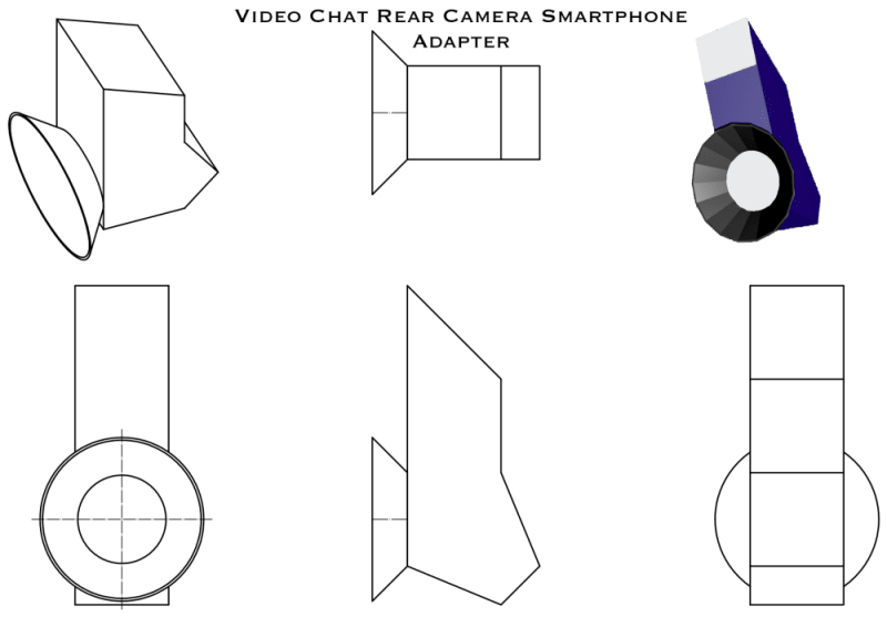 My design works by affixing reflective surfaces to the rear facing camera lens of mobile phones via a modified suction cup having a hollow base, thereby reorienting the camera's view. Existing and future [free] video instant messenger smartphone software applications [Fring ®, Skype (™), etc.] could be used in conjunction with this device and a Wi-Fi or wireless [phone] network.