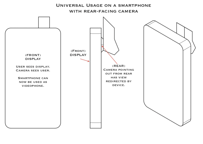 Transforms your existing smartphone into a true videophone, solving the "opposing camera and display" problem, allowing simultaneous viewing and transmission of relevant video -- the fundamental requirement of videophones.