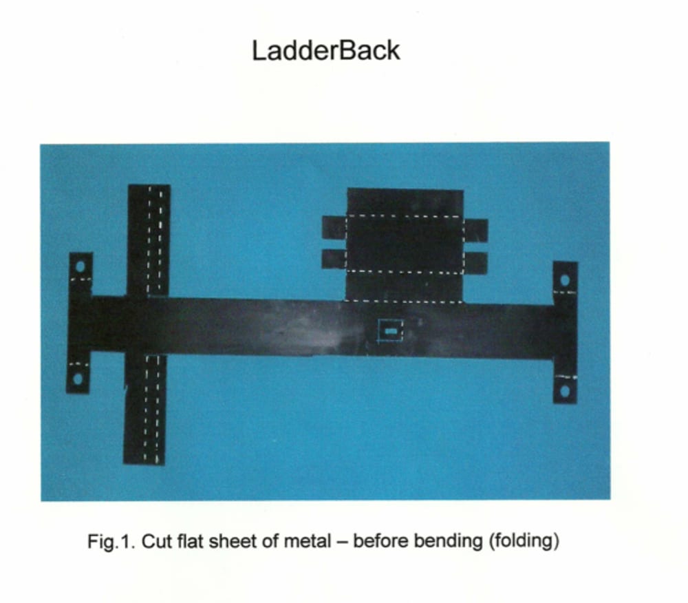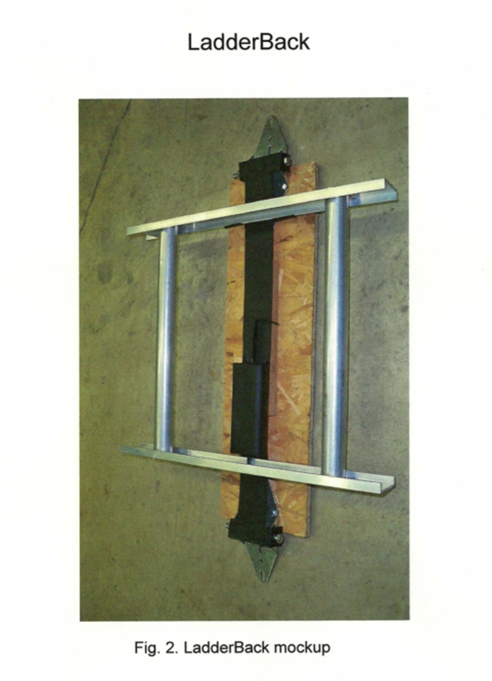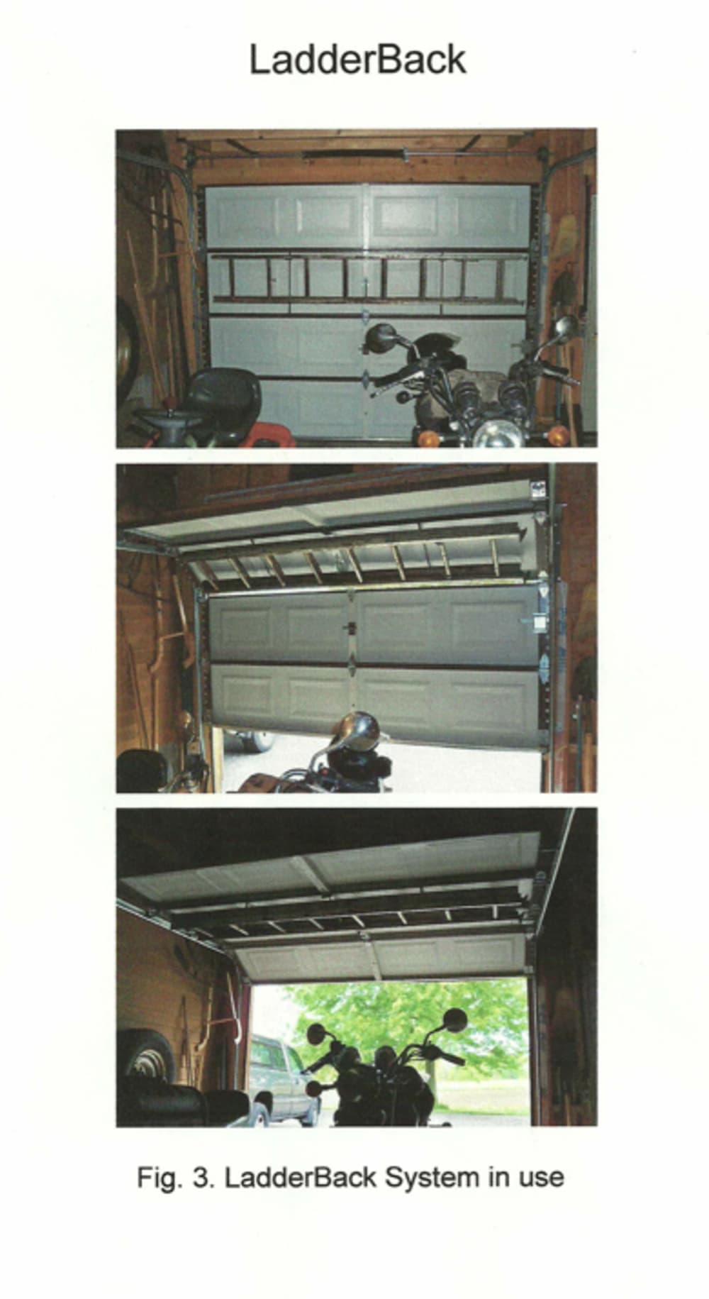 Most home owners have a ladder. When they need to use it, it is typically difficult to access; when not needed it is usually in the way. In either case, it often poses a safety hazard. LadderBack was invented to solve a ladder storage problem. With a LadderBack system, the ladder is never in the way and yet readily accessible. A patent application has been filed with the United States Patent and Trademark Office. Prior art search (http://freepatentsonline.com) has not found any other similar system and therefore, I believe LadderBack is novel. No other ladder storage device has the same or similar attributes. While looking around my garage/shop, I noticed the one place that was not used for any particular storage: the backside (inside) of the overhead garage door. I made a ladder holding device that mounts on the hinges between two of the garage door panels. One leg of the ladder hooks on a top rail; the other leg is secured with a simple spring loaded plunger. The ladder (parallel to one of the door panels) goes up and down with the door. It can be mounted onto or dismounted from the holder only when the door is closed – in the vertical position. When the ladder is overhead (when the door is open) a gravity actuated safety mechanism does not allow release of the spring loaded latching mechanism. This safety element is protected in a sealed housing and, therefore, can not be defeated. There are only five individual parts that are needed to manufacture a completed LadderBack storage system. The main body is constructed from one piece of metal. The other four pieces are a plunger, the gravity actuated locking bar, a spring, and a rivet. Figure 1 shows the main body after cut from a flat sheet of metal, but before a series of fabrication bends and the safety method installation. By minimizing the individual parts, and by utilizing simple bends (folds), the cost of manufacturing is low. LadderBack would come in three standard sizes to accommodate the three standard garage door panel sizes. The top attachment rail could be made adjustable for different ladder widths. Further manufacturing simplifications and cost savings may be developed such as injection molding for one or more parts comprising the LadderBack system. LadderBack installation only requires two bolts or pins that slip through the top and bottom integrated brackets and the roll pins of the garage door hinges. Figure 2 shows a close-up view of a LadderBack mockup. Figure 3 shows the device in actual use. There are approximately 115 million households in the United States alone [http://www.census.gov/prod/1/pop/p25-1129.pdf]. [http://wiki.answers.com/Q/How_many_homes_are_there_in_the_US] claims there are 129.4 million homes in U.S. I assume the difference may be due to a portion of these are apartment dwellers. There are also numerous small businesses and apartment complexes that have integrated shop space. Together, the overall market is substantial.Anyone who has ever tripped over their ladder, or tripped getting to it, is a potential LadderBack customer!