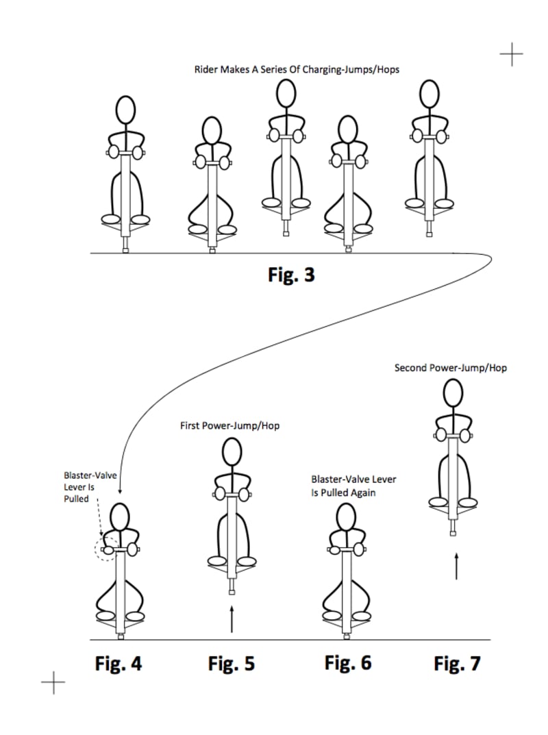 Pogo sticks have been around for a very long time and there have been some recent improvements that have caused resurgence in their popularity. The use of air-springs and special configurations of elastic bands or cords have recently allowed users to jump much higher, where jumping heights of six or more feet have become common. However, even though riding on a pogo stick is a rather unique experience, simply bouncing around to attempt to reach the greatest height becomes boring after a while and most riders eventually and unfortunately lose interest. The new Air-Blaster Pogo Stick was designed to exhilarate the riding experience and to make it possible for pogo stick riders to attain jumping heights never before attainable. The Air-Blaster Pogo Stick gets its name from its ability to store air under high pressure that’s accumulated in an on-board air tank by a built-in reciprocating-piston air pump. The stored high pressure air is then subsequently released so it acts on a relatively large diameter piston to assist energy stored and released by a main spring when the rider desires to make a 'power' hop. In other words, the rider first makes a series of 'charging' hops (see illustrations) to operate the air pump and accumulate high-pressure air in the air storage tank. At exactly the right moment or at the trough of a hop, the rider pulls on a blaster-valve lever that’s located on the hand-grip to release the stored air directly on top of a large diameter piston that acts to force the top end of the main spring downward inside the main tube. The force exerted by the released air greatly supplements the energy stored in the compressed main spring and at that time you might say that all hell breaks loose! This particular design as illustrated uses an auxiliary spring to drive the reciprocating air pump piston during the charging hops. The main spring actually floats inside the main tube so that when air is released on top of the power piston, the spring will expand at the same time the released air is acting on top of the power piston to move the top end of the main spring down the main tube in which it is free to move. A rough model was built out of mostly PVC pipe and fittings at a local college machine shop. It was then charged with air at 110 psi from a remote compressor (it had no built-in air pump). When the 200 lb. rider pulled on the blaster-valve lever located on the hand-grip to release the stored air, he was easily thrust upward at a height estimated at over five feet! The Air-Blaster Pogo Stick is an extreme sport device and it is not child’s play by any means. It’s a trade-off and somewhat of a compromise to the not so well-known gas-powered pogo sticks of yesteryear which were uncontrollable and extremely dangerous. This pogo stick is as gutsy as the rider wants to be!