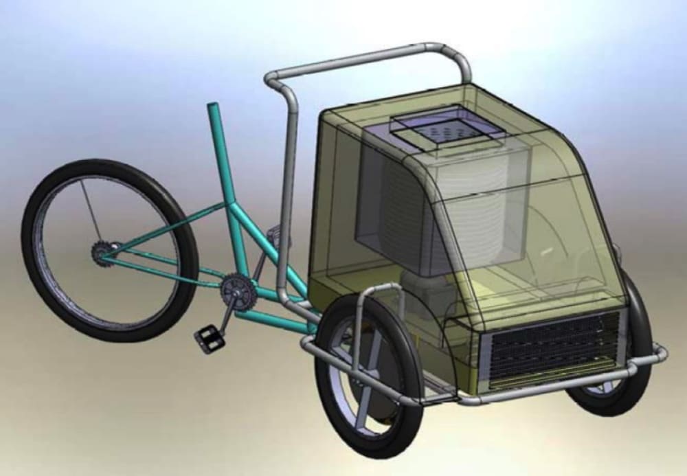The inertial forces of the tricycle will produce electrical energy to move refrigerating system. When at rest and slow speed, no generating will be done.