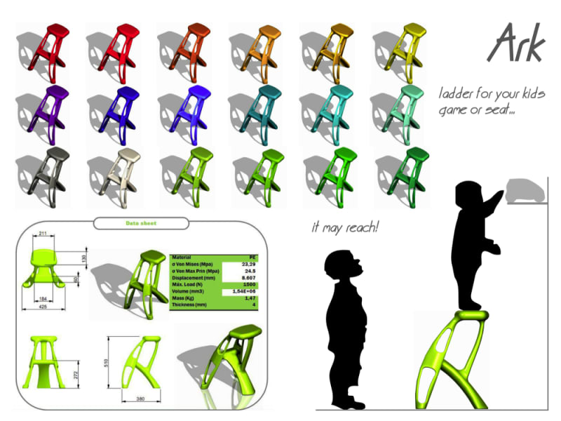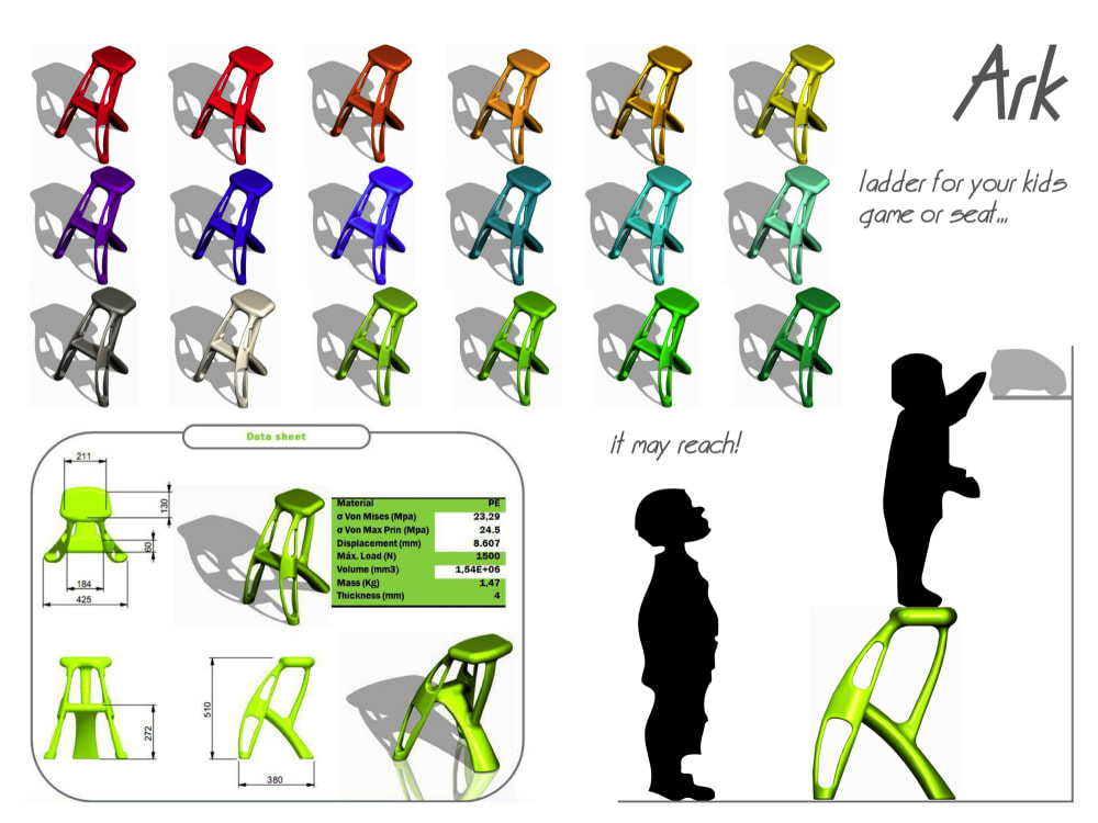 Ark is a ladder specially designed for kids between 3 and 12, for every time they need to get toys, but they can't. The challenge for this product was to design a one piece ladder and do it in one process for economy and low weight. The goal was reached with a product that can be manufactured by a rotationally molded of dust polyethylene and only have a mass of 1,5kg.