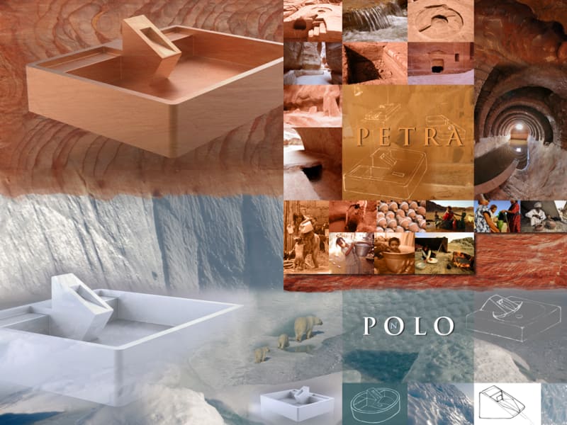 The New Bath Collections will have innovative ways of use and reuse of water, inspired in the Nabateans water systems for a real change in the consumer habits of urban populations in benefit of poor people. By creating two new relaxing atmospheres, one reproducing the ice and colors of North Pole and the other the natural red rose stone of Petra will give the user a new connection of leisure and proximity with Nature and the natural element - the water, in a way of seeing it as an essencial source of his well being and learning to preserve it.