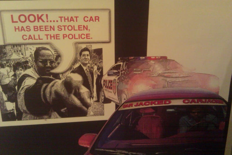 The theft device is located in the front exterior windshield glass and laminated on the exterior rear glass of an automobile. The words “STOLEN” or “CARJACKED” will illuminate on the exterior windshield or rear glass when improper entry has occurred.