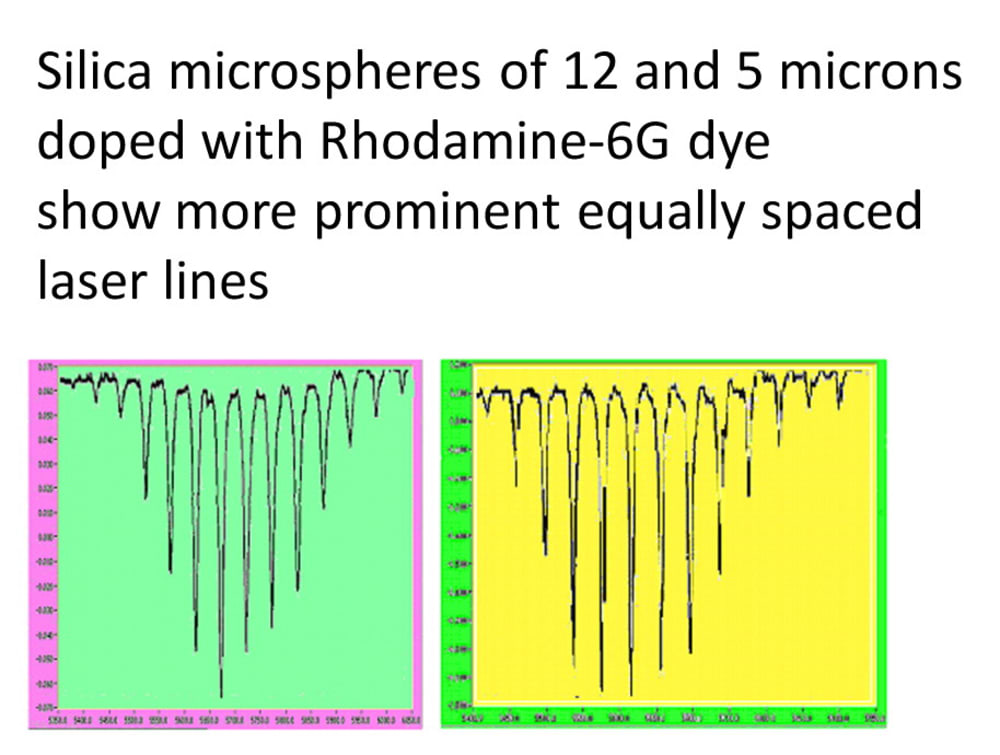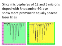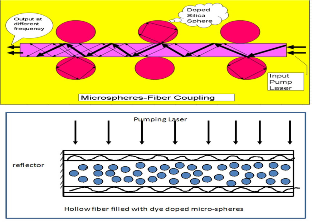 The glass microspheres are doped with specific dopants to generate the desired laser lines. The spheres are adhesively attached to the solid fiber or inserted into a hollow fiber and pumped by a laser source at one end of the fiber (Illustration-1). A fraction of the pumping beam enters the microsphere and undergoes multiple internal reflections until such time that sufficient energy has been built up that a laser beam exits the microsphere, at different wavelengths than the pumping beam. The surface of the microsphere acts as an optical cavity that provides feedback at specific wavelengths. The fiber with the spheres is wrapped on a pulley with the two ends of the fiber are free for pumping and collecting the outputs (Illustration-2). The microsphere produces a plurality of output laser lines. Illustration-3 shows the output from 5 ?m microspheres doped with Rhodamine 6G and pumped with a 532 nm source from a Nd:YAG laser. It is seen that for the 5 ?m microspheres a plurality of laser output wavelengths from around 5490 ? to around 5980 ? are produced. Different lines can be produced by changing the dopant material.