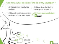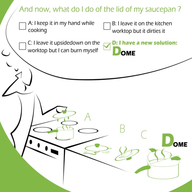 It is a lid that is a dome that we don’t need to take off the saucepan: you just open it! There is just an axis and semi-spheric parts that rotates around this axis. There shall have a range of different sizes of dome to fit different sizes of sauce pan. The dome simply adapts on the saucepan top and it can be easily removed, in order to be washed. To close it, the two parts of the handle can be brought together by clipsage. Then, they can be separated very simply. We don’t need to touch hot parts, so it prevents injuries, and as it is known, domestic accidents are very numerous. Finally, at the end of the preparation time, it can be used as a dish cover you add some “show” to the meal.