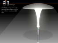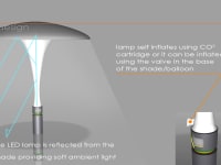 The base of the light holds a rechargeable battery pack and CO2 cartridge. When the top is twisted the shade inflates and the light turns on at the same time. There is a clear pointing arrow on the top part, indicating the direction of the turn, the arrow glows in the dark as well as is indented for tactual feel. Below the top part is a LED battery indicator visible from all sides. Base of the shade has a valve for deflating it as well as auxiliary inflation point when CO2 is not available.