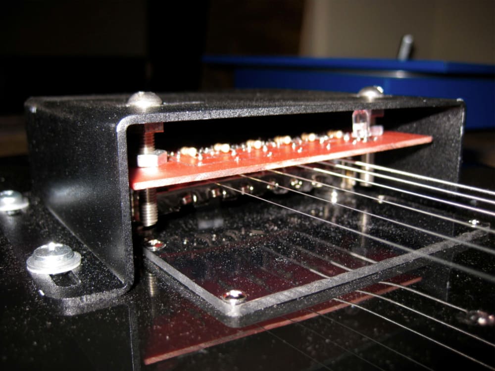 Each of the six strings on a guitar were outfitted with an infrared LED/photodiode sensor pair, which where summed together and fed into a standard guitar amplifier. Custom circuit boards where fabricated in-house to hold the sensor array above each of the six strings of the guitar. A steel light shield was also fabricated to block outside light that could potentially cause unwanted noise and distortion.