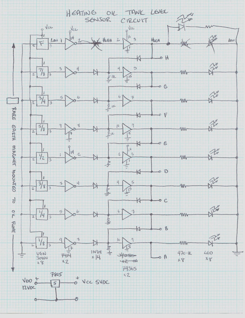The most cost effective solution was to adapt the existing float type level gauge to an electronic readout. I decided on adding a magnet to the float indicator disk, and use that to activate some Hall Effect type switches. I located some surplus non-latching Hall Effect switches, UGN-3040U made by Sprague Electric, now known as Elegro. There are 8 switches used, to indicate tank levels in eights. The UGN-3040U switch has a low voltage output when sensing a magnetic field of sufficient strength. The circuit I designed, sends this output through and inverter stage, and then through a buffer stage. The output from the "Full" buffer is sent to the input of the "7/8" buffer via a 1N914 diode. The inverter outputs are isolated from the buffer inputs also by the same type 1N914 diode. This arrangement allows for cascading the stages to allow for a "filled in" looking bargraph, when only one switch is activated by the magnet.