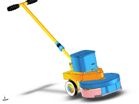 Now, according to the pictures, the product can be divided into following parts: Handle, Base, Carriage, Rubbing medium and Gear train. The length of the handle can be adjusted at any position. This PVC part will be manufactured by extrusion molding. On the front of the base part there will be holes through which water will poured onto the floor. The water will be carried through a piping system from the bucket (situated at top) which can carry water upto 4 litres. The carriage will house a part of piping and the gear train. The gear train works in this way:
