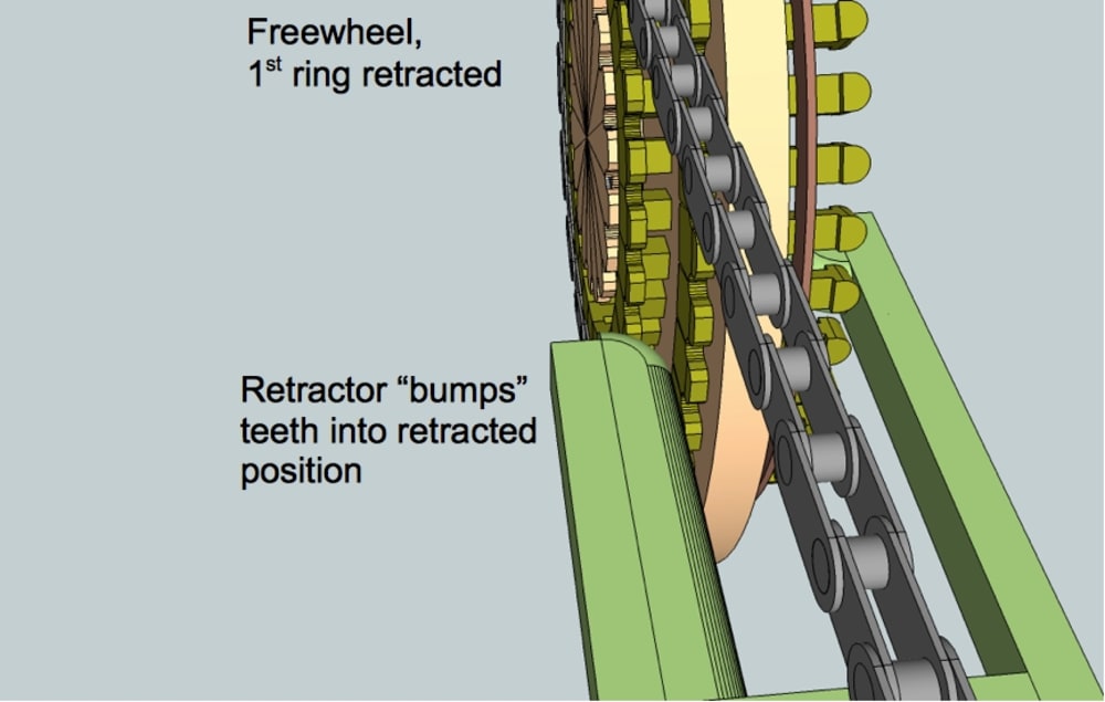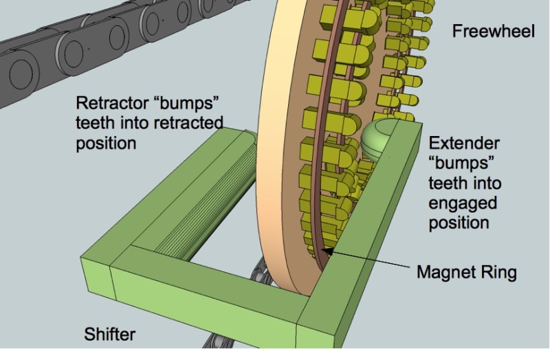 This concept addresses those problems by using rings of retractable, bistable teeth mounted in each of a pair of wheels. The gear ratio is changed by extending/retracting the rings of teeth to choose an appropriate combination. The teeth are moved by a shifter fork (light green) operating in the portion of the wheel where the chain is not engaged. The shifter only serves to move the teeth from one stable position to the other.