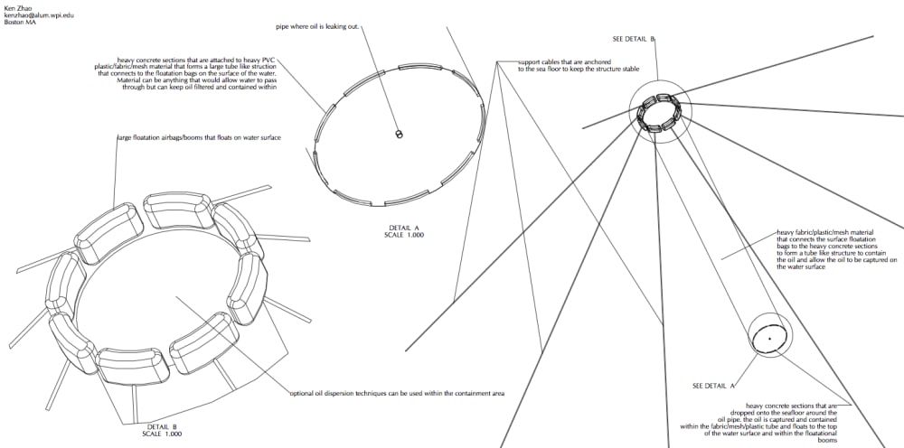 In the wake of the BP oil spill, this device can be used to contain the oil from deep sea drilling blowouts. A large tube of heavy duty fabric/equivalent material are sewn together and then attached to large concrete sections on one end and to large floatational booms on the other end. The large concrete sections are then lowered to the seafloor encircling the blown oil pipe, the oil will travel up the tube structure and be captured within the large floational booms on top of the water surface. To keep the booms stable, cables are anchored to the seafloor(or to large concrete blocks then dropped to the seafloor). Oil dispersion techniques can also be used within the containment area. Such a device can be built ahead of time, cost effectively, and can be deployed in a short amount of time.
