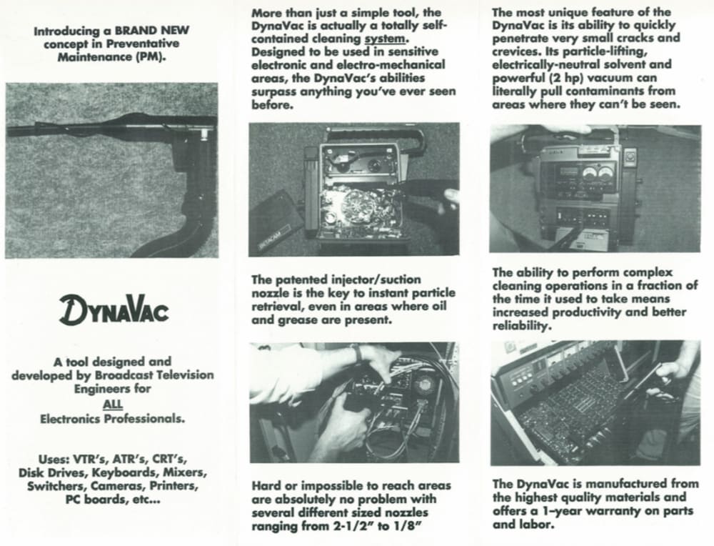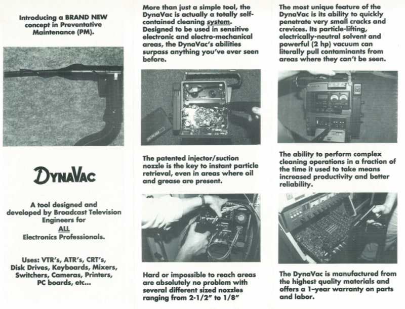 The DynaVac is a tool that I invented, developed, applied for a patent on, and marketed mainly to Broadcast Television & Radio stations worldwide to be used to clean electronics and electro-mechanical assemblies better and quicker than traditional methods. In its simplest terms, the DynaVac is basically a hand-held, custom-machined vacuum nozzle with a precision, push-button spray nozzle attached at the vacuum nozzle end. The other end of the fluid push-button assembly tubing is connected to a commercial-grade, pressurized canister of electronics cleaning fluid. The operator turns on the vacuum, typically a shopvac, brings the nozzle tip to within 2-3 inches of the surface or object to be cleaned, presses the spray button and the electronics-grade cleaning fluid coats the surface or object. At the same time, the vacuum acts on the surface tension of the cleaning fluid and pulls it, any dirt, dust, particulate matter, grease and oil out and away from the cleaning area, leaving behind no residue, and deposits it within the shopvac.