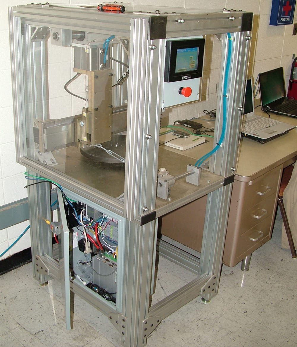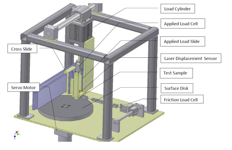 The system places a known load on a test sample, pressing it against a precisely speed controlled rotating disk. A laser triangulation system measures wear at a resolution of 10 nm. Wear, friction, and temperature are continuously monitored. When the rates of change in these variables become constant, the system is said to be “steady state,” at which point the system automatically initiates tribological data recording. Proprietary algorithms continually assess the data to determine the point at which a specific PV combination test is “done.” Proprietary machine controls then automatically index to the next PV test. This process is repeated until all pre-programmed tests are completed or sample failure has been detected.