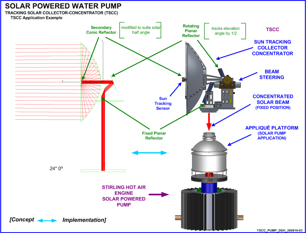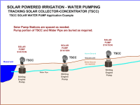 This proposal presents a stand alone, self powered, low maintenance Solar Powered Irrigation water pumping example which is a follow-on application of an earlier NTB entry entitled “The World’s Most Versatile Tracking Solar Collector-Concentrator” and is based upon that presentation’s Tracking Solar Collector-Concentrator (TSCC). Reference: