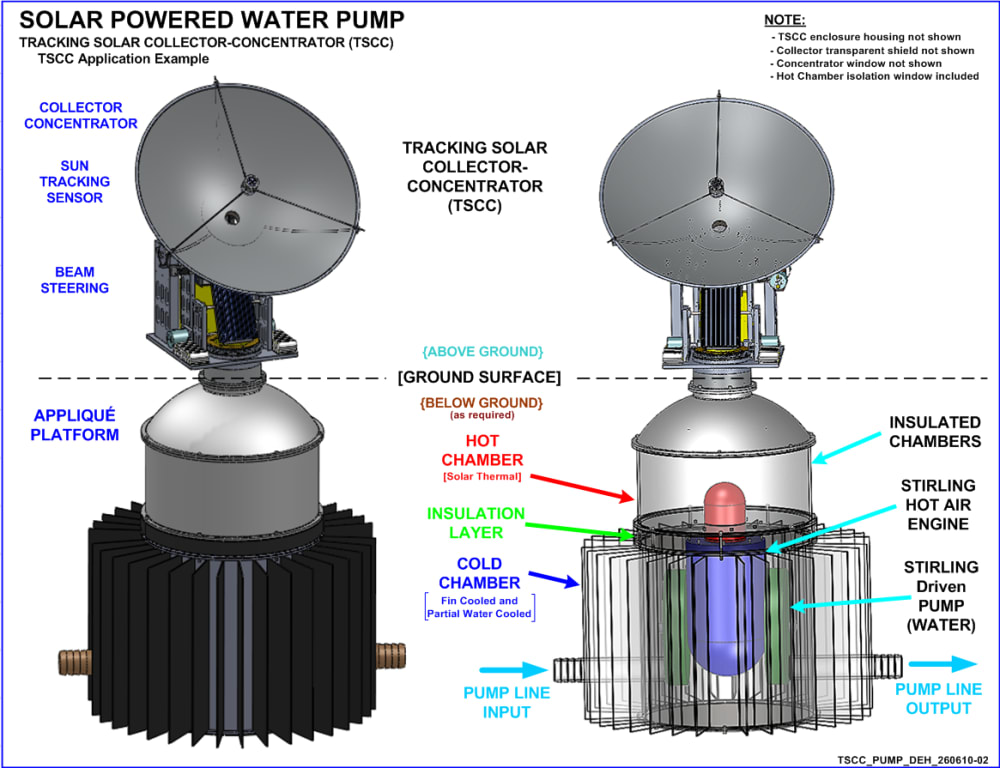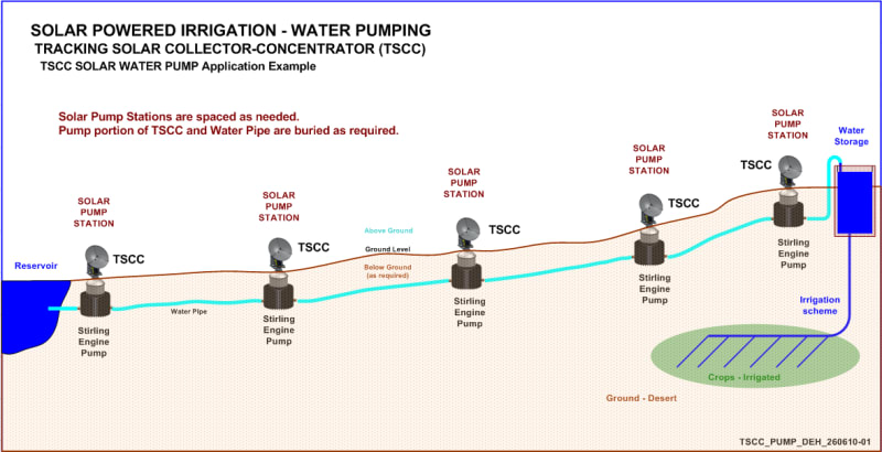 Key to this application is the TSCC efficiency, low initial unit cost, the long trouble free operating cycle of Stirling engines, easy site transport, simplified installation with easy re-configuration options with no long term operating costs.