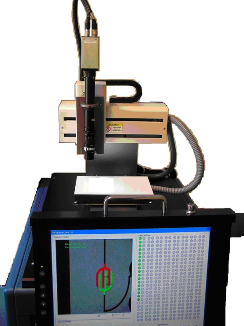 A system was devised to aid in the inspection of Micro Electrode assemblies utilized in clinical lab instruments to conduct impedance measurements on living cells in a 384 bottomless well casing with the said electrode layer bonded to the housing creating the closed cell real time data acquisition instrument for assay tests.