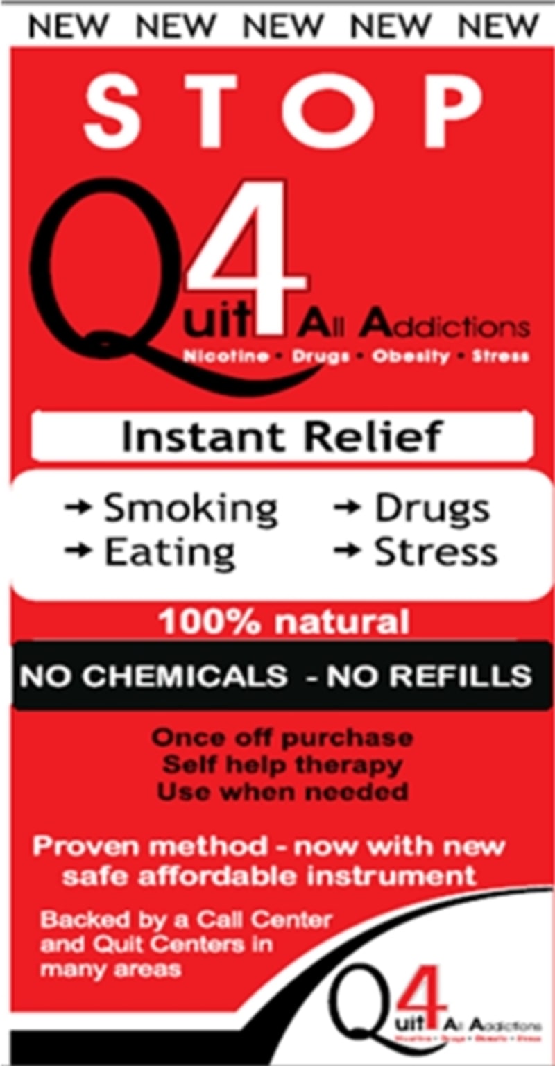 Quit for All Addictions is a device and method that provides relief for those addicted to Nicotine, Drugs, Obesity and sufferers from stress.