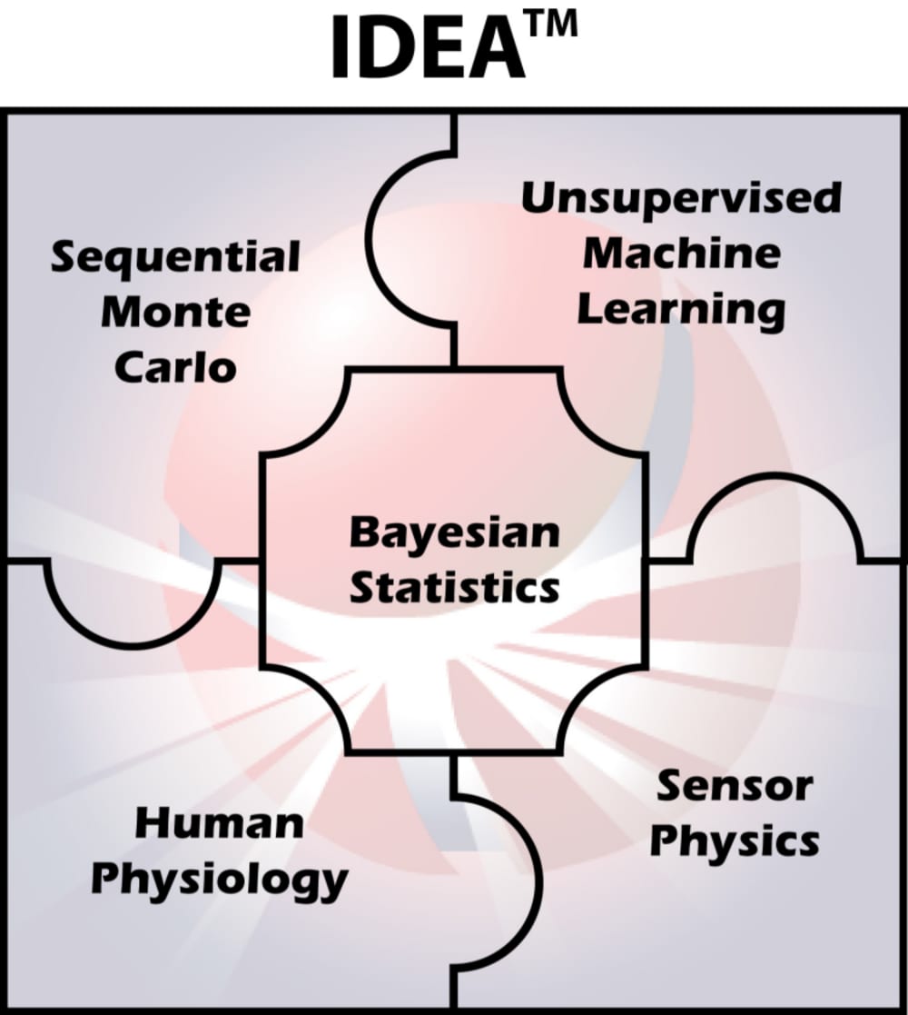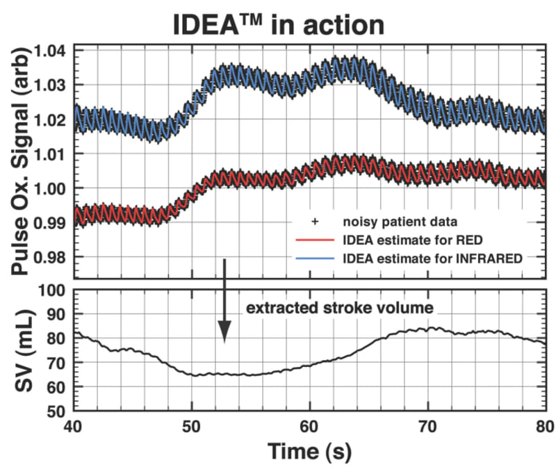 Pulse oximetry measures light absorption by blood as it pulses with each heart beat. In conventional pulse oximetry, the height of the pulses are converted to blood oxygenation. As it turns out, these light pulses contain far more than oxygenation levels: it also carries information about the patient’s cardiovascular system, including stroke volume and cardiac output. However, the information is embedded in the detailed shape of the pulse and the way it changes over time, so extracting it is difficult. Conventional digital signal processing methods are not up to the task because those merely focus on particular features of the pulse. Instead, this problem requires software capable of analyzing the entire pulse dynamics. To this end, we have created the Intelligent Data Extraction Algorithm or IDEA™. IDEA™ is an elegant confluence of recent advances in probabilistic inference, unsupervised machine learning and quantitative medicine. As such, it represents a paradigm shift in data processing, one that is capable of “understanding” noisy pulse signals and interpreting them in a physiological context.