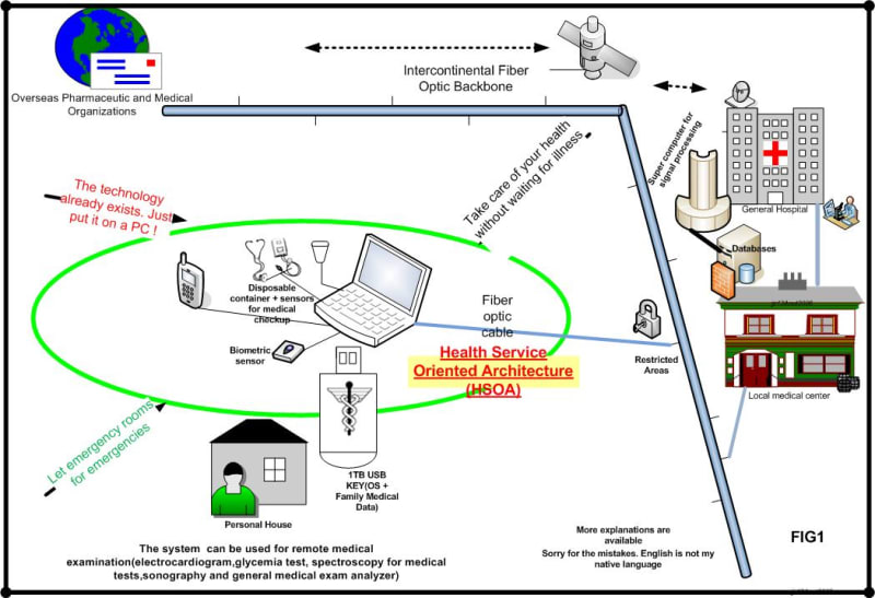 HSOA puts human health care at the center of its preoccupation. Nowadays, people let their health worsen for many reasons: waste of time in emergency rooms, too few medical workers, fear or feeling ashamed to take medical tests. As a result, many people live with chronic diseases and decide to see a doctor when it’s too late. Every day, physicians say that some illness as cancer, diabetes or cardiac trouble could be treated if the patient did not wait so long before going to a medical center. HSOA aims to improve the medical system as it works now. It helps people to take care more tightly of their health by permitting them to make medical checkups more often at their home. Nowadays, many diseases can be detected as soon as possible thanks to a drop of blood, expiration air, spit, urine, excrement and so on. By taking such tests more often allows collection of more statistics and prevention of diseases at their earlier phase. Other medical can also be made as pregnancy test, ultrasound,scanning but it recommended having medical assistance to do so. However, the patient can stay at home most of the time. It could be much easier and costless for public medical systems to be managed in such a way. Data collected will be sent to medical centers where many experts and power computers could examine them. People will be called to go to a medical center only if some worrying signs appear. In such case, physicians will know a lot of other information about the patient's health history. Furthermore, some advice could be sent much earlier to the patient about taking some vitamins or eating some foods to improve their health. Our system could help to prevent pandemics by finding germs as soon as they appear in a region. Although the confidentiality will be respected in each phase of the process, information about illness symptoms would be shared among medical and pharmaceutical researchers throughout the world. This last argument will reduce time in finding adequate medication. Although the system use a PC to operate, security is guaranteed throughout the process. The operating system and the medical data of a family (4 members for instance) will be saved in a 1 Terabyte USB key. By initializing the OS, some information coming from the DNA of the family will be processed. So any other person can’t hack the system. Furthermore, each medical exam checks some biometrics information about the patient’s identity and the system checks DNA during each kind of test (spit, blood and so on). Webcam could also be used to increase security during remote medical examination. Fiber optic cables will be used to alleviate signal distortions but some data such as text and statistics could be sent by satellite. A person in a big hurry can use his cellphone to make some daily tests such as glycemia but the data must be saved in the USB key and transfered to the medical center