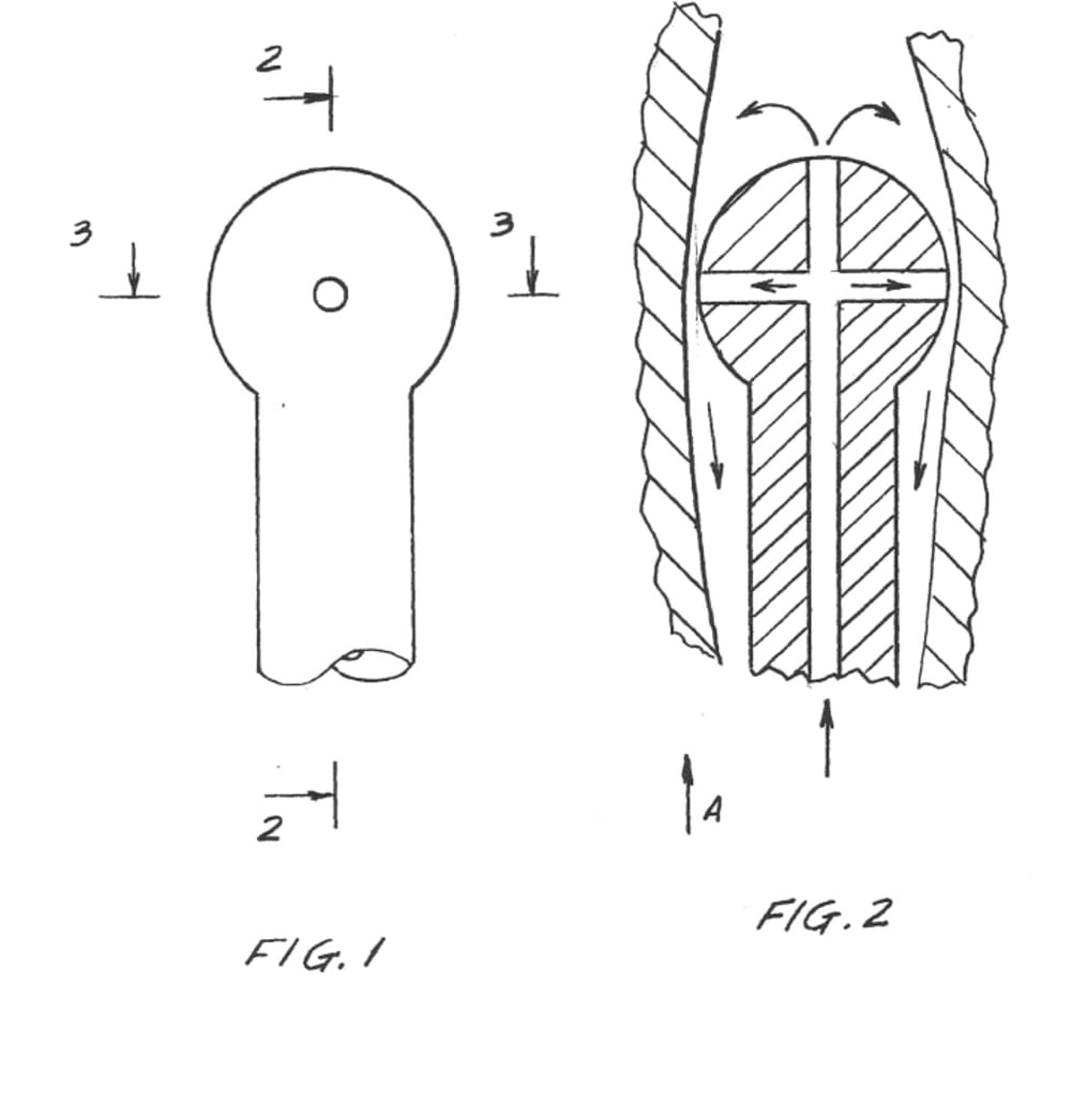 Figure 2 is a longitudinal cross-sectional view taken along the line 2-2 of Figure 1, with the low friction catheter shown in use inserted in a urethra. The direction of insertion of the low friction catheter shown by the arrow marked with the letter ”A”. The direction of flow of pressurized distilled water is indicated by the unmarked arrows. The flow of distilled water between the wall of the urethra and the low friction catheter creates a low friction interface which facilitates the easy insertion of the low friction catheter into the urethra.