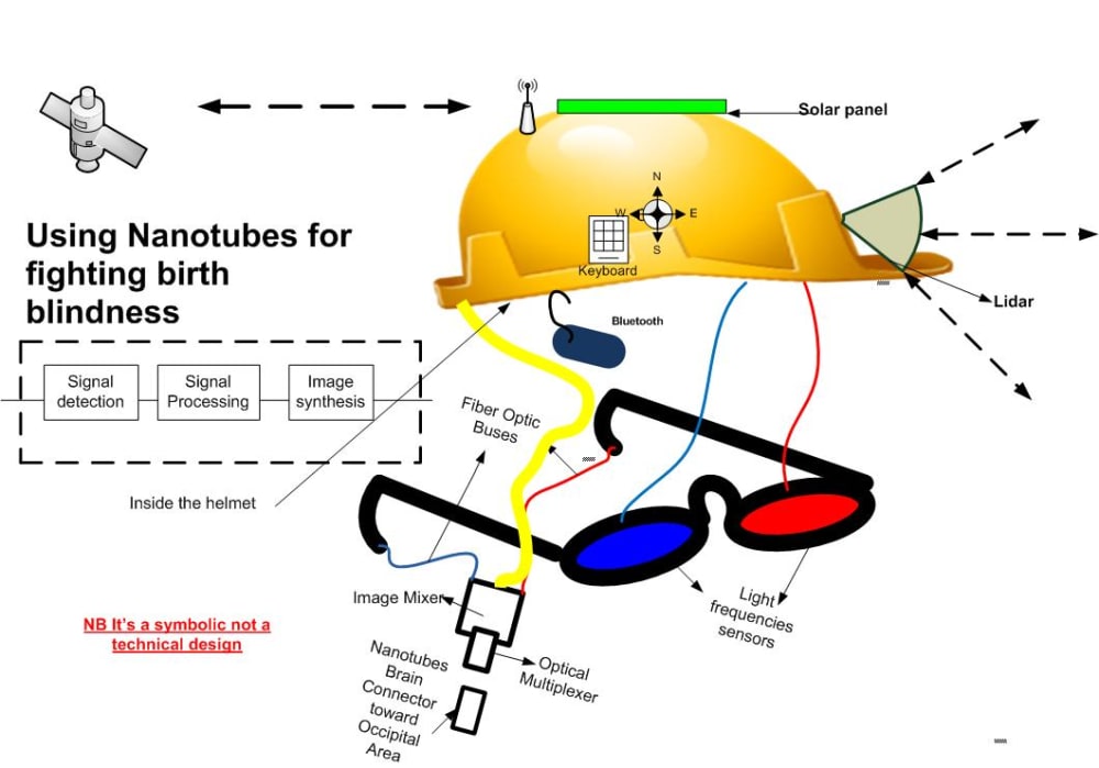 Anti-Blindness System. This project utilizes electronic circuits and optical devices that already exist. Inside the helmet, we’ve put a polarimeter and a spectrometer which help blind people to obtain precise information about soil composition(snow, mud), deep water, vacuous spaces and so on. We also put a GPS and a cellphone connected on the internet in the helmet so the owner can find his way and go wherever he wants. The spectacular glasses are actually a set of optical lenses functioning as light sensors. The glasses work as webcam lens but they will also be able to process infrared radiation for improving night vision. It is important to advise that the images obtained by the system won’t be the same as for those who can see. Many parameters such as color and emotion will not be observed. However, those glasses will help the owner to get a 3-dimensional vision to move freely, recognize his friends and family members’ silhouettes and prevent him from falling into holes or hit objects. Because the owners didn’t know what is vision some training will be necessary before they can get autonomy for moving by themselves. The helmet contains a video laboratory that analyses the light as A human retina does. After the signal is processed, it is transformed into electric impulses and sent to the occipital brain area (the vision nerve center) thanks to nanotubes connected to optical nerves. Batteries assure 3 hours of autonomy during darkness. Public authorities will have to put in place some additional arrangements to improve the system. For example, they’ll have to recommend banks, restaurants, department stores, subways and airports to put special light transmitterS at their main door, their escalators etc. Besides this, the system can save usual paths utilized by the owner and help him to get back home or to find out the nearest police station in case of emergency. Certainly this system will be improved with time and will help blind people (birth blind or not) to acquire or recover more accurate vision. We firmly believe in our system because, nowadays, neurologists can realize minor brain surgeries in less than 4 hours. Patients are able to return home the same day. In the future, it will also be possible to apply nanotubes to other dysfunctions as paralysis due to vertebral column injuries.