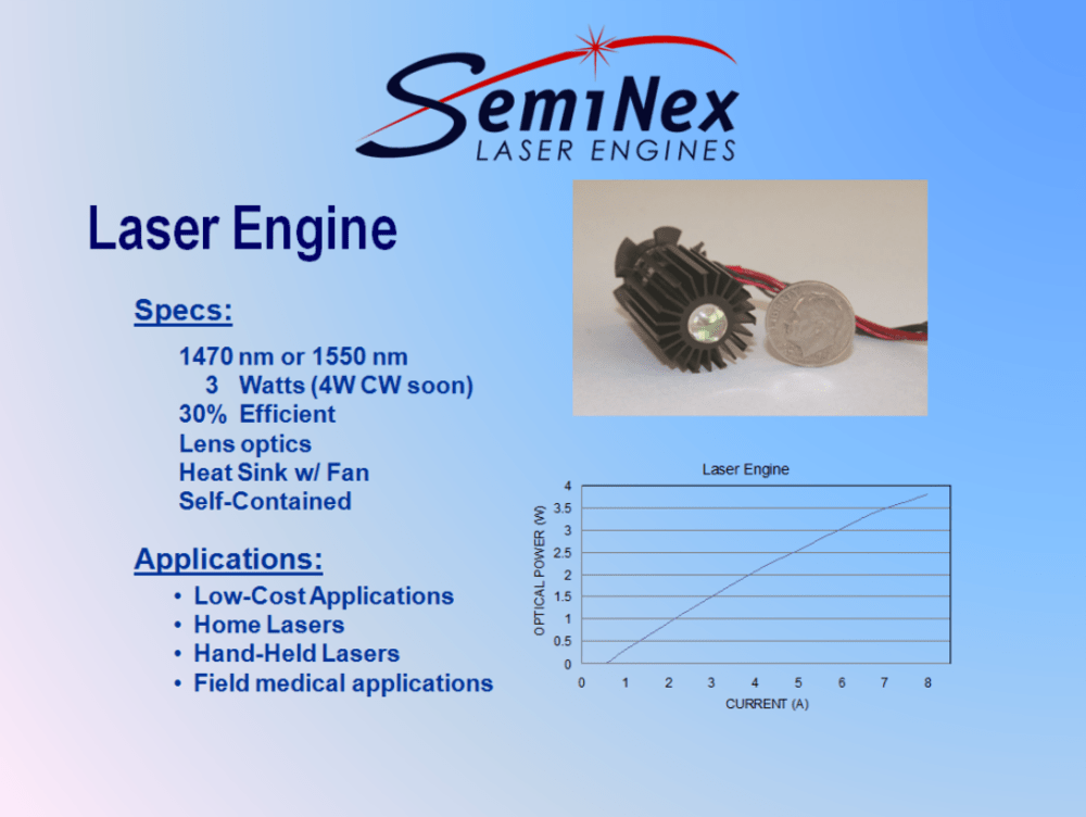 The SemiNex hand-held laser uses the patented Laser Engine, a high efficiency laser, which has a heat-spreader, convection cooling device, and optical lensing element. The Laser Engine is available in 1470, 1532, and 1550 nm wavelengths and features an excellent power conversion efficiency of 45% watts/amp, offering 3 watts of continuous optical power from 6.5 amps of input current.