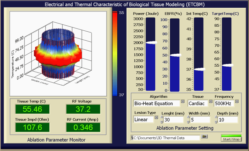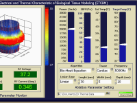 Radiofrequency ablation (RFA) is a nonsurgical medical procedure used for treatment of cardiac disorders such as arrhythmia or destruction of cancerous tumors in lung, kidney, breast, liver or any other dysfunctional tissue diseases. RFA is also used for treatment of varicose veins, severe chronic pain (such as lower back) as well as many others medical uses. Theoretical modeling of biological tissue using computer simulation tools can be very helpful in providing vital information on the electrical and thermal characteristics of the tissue in order to determine a proper treatment for individual patients. The Electrical and Thermal Characteristic of Biological Tissue Modeling (ETCBM) program provides a visual three-dimensional (3-D) and numerical representation used to determine the temperature distribution and electrical property of various types of tissues. This tool uses the minimum amount of RF energy required for the procedure; thereby resulting in the safest possible ablation treatment. The ETCBM program is easy to use and manufacture, and has great marketing potential since it can be used by doctors, scientists or medical research facilities such as universities. Similar products in the market have limited capabilities and are very expensive (often priced per seat and out of reach for many research teams). Figure 1, depicts a simulated ablation setting for a 3cm diameter circumferential lesion created on cardiac tissue with 500KHz RF at an energy level of 2000 joules and Bio-Heat equation algorithm. Figures 2 and 3 represent the actual lesion created using a standard RF generator with the above settings and the 3-D simulated graph respectively.