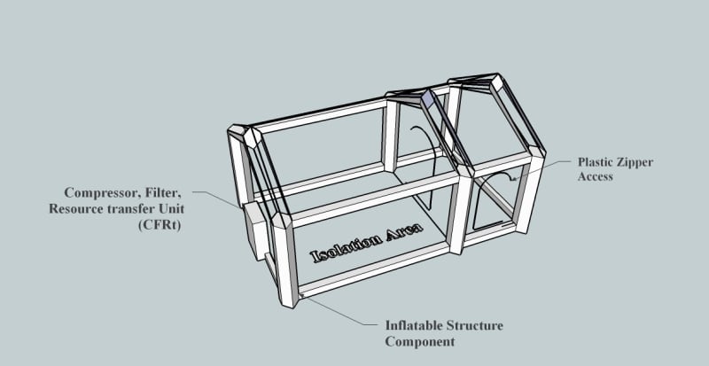 The inflatable clean room is based on three key components. This includes internal encapsulated inflatable structural members, plastic zipper access doors, and an attachable compressor, filter, and resource transfer unit (CFRtU). The internal inflatable structural members provide the structural strength. These components are similar to the features found in inflatable children’s play structures seen at parties, fairs, or carnivals. The plastic zipper access doors utilize the same simple technology as that found in zipper seal food storage bags. The compressor, filter, and resource unit is responsible for inflating the structure. The unit also acts as the air filtering system for air that is transferred between the inside and outside environments. Under extreme conditions the filtering component could be bypassed and self contained oxygen or oxygen enriched air supplies could be provided through the system. The CFRt unit also would act as a transfer portal for power, communications, and water. It should also be noted that during the manufacturing of the inflatable clean rooms additional plastic zippers could be attached to the exterior edges of the structures, additional zipper access doors inserted, along with the addition of a number of CFRtUs thus allowing multiple clean rooms to be attached together thus creating a clean room complex.