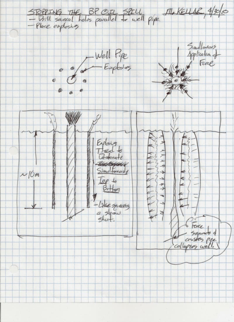 I propose drilling a set of pilot holes, parallel to the well, to a depth of several meters. Into these holes would be lowered explosives similiar to the British Bangalore Torpedo. The purpose would be to produce a coordinated application of force - starting at the top of the well head and proceeding downward - to squeeze the well pipe closed along a significant length, and/or collapse the well itself, to staunch the flow. Drilling a set of small diameter holes would be quick. Using HP explosives would be damaging to the local environment, but better than continuous spill for months.