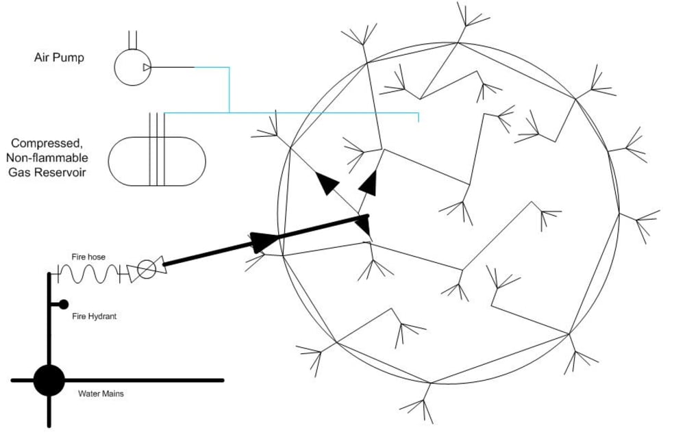 Piping, fabric, fittings and lining materials as well as the gas delivery portion would need to be selected for fire resistance and, possibly, re-utilization.