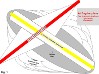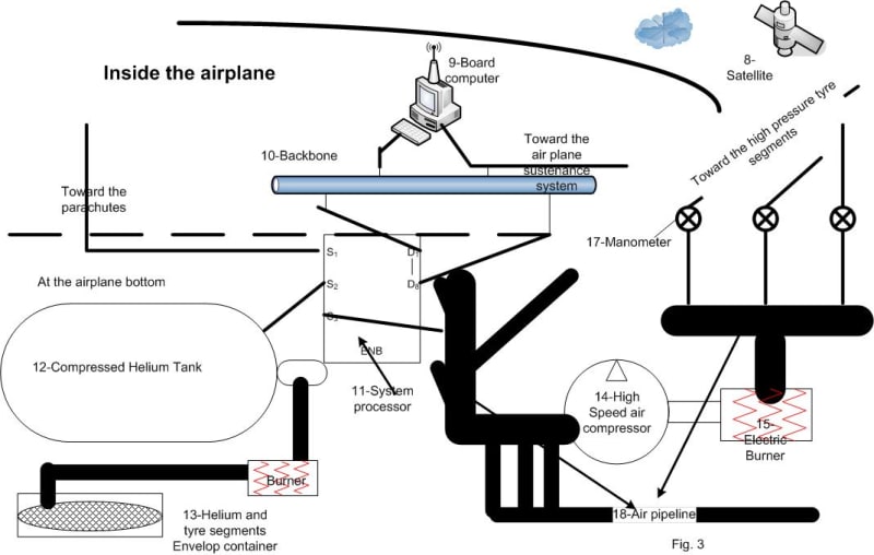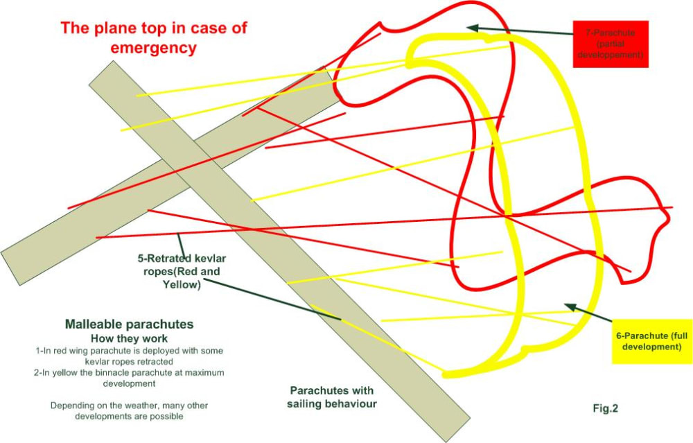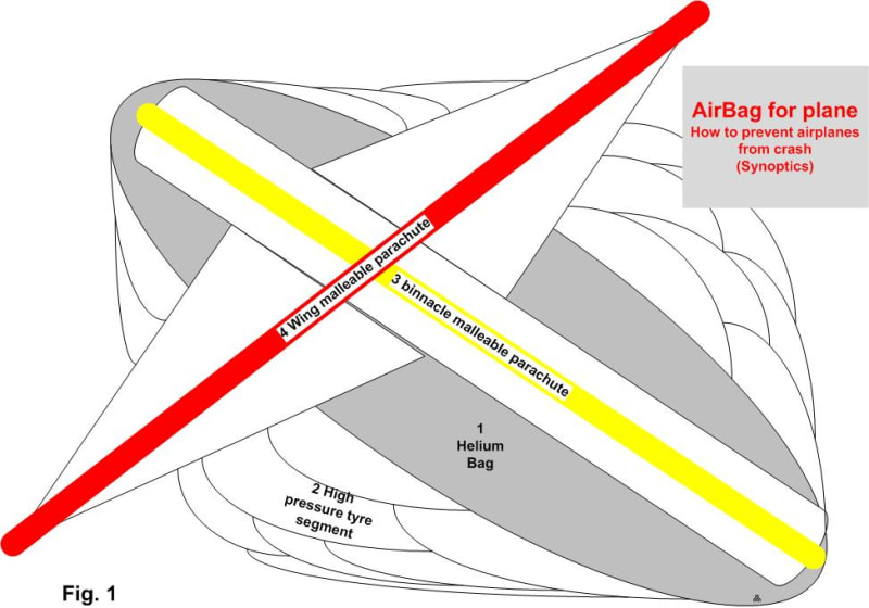 This project aims to reduce significantly the number of airplane crashes throughout the world. Considering the consequences after each crashing, we think it’s absolutely nonsense to let airplanes crash over a distance usually less than 2 kilometers when there is on board enough gas and electricity to permit the plane to travel over more than 10,000 km. In the first time, our idea will prevent these tragedies and in the future, when all this technology will be mastering , it’ll help to strengthen safety and manageability in airplane navigation . For instance, our system could help in the future to land an airplane on a very restricted area than now. Nowadays, it becomes very important to improve security in every branch of human activity. It is not enough to make a gadget work, we also have to protect human life. Our project presents 3 parts: 1-At the top of the airplane(fig.1), there is a set of 2 malleable parachutes (100m X 20 m each). These parachutes (fig.2) are restrained with Kevlar cables and work as boat sails i.e they can develop or retract to increase the stability and reduce the freefall speed. 2- Under and outside the airplane, we can trigger the development of a helium bag. Many high pressure tire segments are attached to the helium bag. In a first time the parachutes and the helium bag are triggered to slow down the airplane freefall to about 10%. The task of the high pressure tire segments is to transform the airplane into a dirigible balloon during about twenty minutes and to help to definitely stabilize the airplane by eliminating the uncontrollable fall. The amount of rising warm air in each segment is determined by the computer board and depends on atmospheric conditions and on the wind speed around the airplane. Once the airplane is stabilized, it can be towed with a power helicopter or to alight on the sea. 3-Inside the plane (fig.3), we organize a place where we place a 3 ton compressed helium tank, a 2 ton power air compressor and pipelines air collector for aspirating the air around the plane for inflating the air segments in twenty minutes or less. The high speed of the compressor is the main challenge of the project. We must find a way to obtain this result by realizing an over consummation of the airplane gas by the compressor. The RAT will also help in the process by bringing more air and electricity to the whole system. The board computer is responsible to trigger the entire system by itself and analyze the behavior of the airplane components and atmospheric parameters in very short time (less than 1 second). The total weight of the system by itself is 7 tons (2 tons for the parachutes and Kevlar ropes). We realize it by bringing smaller modifications for saving weight to the Airbus A380. Actually, we still hope to reduce this weight thanks to the last improvements in aeronautic and elastic materials.