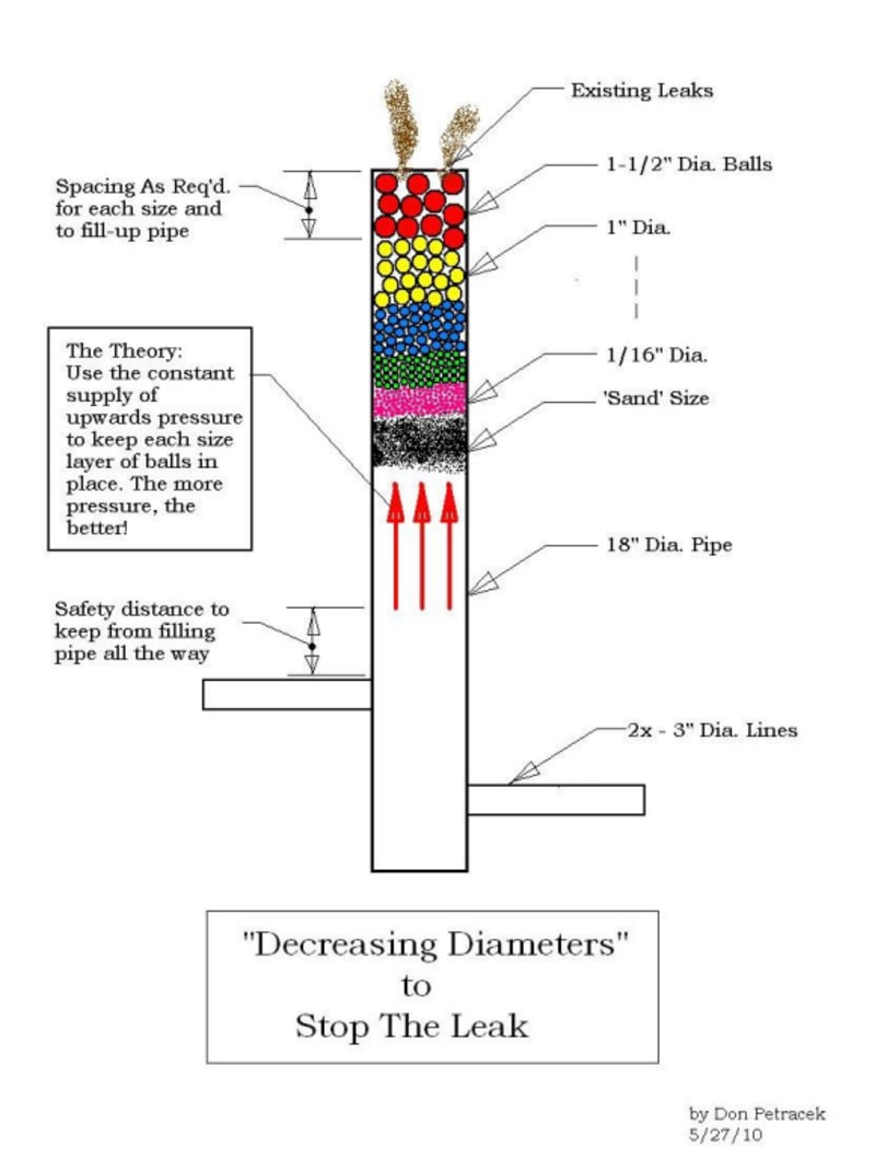 The theory: Use spherical shapes (balls) because of its ruggedness, verses something with sharp edges which can break off, and something that is a different size. Each layer of balls (approximately 2ft high) keeps each other layer of smaller balls below it in place--it would be very difficult for them to pass. By the time you get to the 1/16" dia. balls, there should be enough resistance for the mud to work (be stopped) because of the similar viscosities from one to the next.
