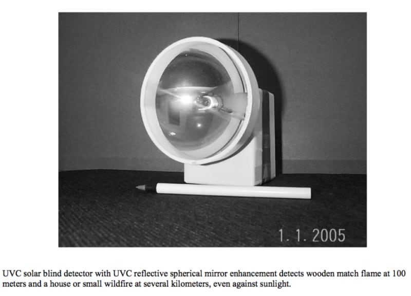 This low cost innovation utilizes a cylindrical Geiger Mueller ultra-violet C (UVC) detector mounted axially in a non-imaging, electroplated or plastic spherical collector. This collector is easily constructed using a nickel phosphorus coating to reflect UVC short wavelength light obtained from decay (outer orbital electrons collapsing) in flaming materials including wood. This arrangement permits reduced heating of the detector in direct sunlight due to axial spreading of the non-focused and out-of-band IR energy. A unique distinct advantage is obtained by the fact that off-axis, the focal point moves axially, moving a focal “ring” along the length of the cylindrical detector. Alternate low cost easily manufactured, related designs are available. Although flat Geiger Mueller detectors are available, the use of conventional optics, leads to poor performance because of the minimal enclosed gas discharge working distances, local overheating by the sun and limited off-axis response. Other optical designs suitable for use of collectors, such as long wavelength infra-red detectors, typically require expensive band-pass filters and often, cryogenic cooling not easily provided in remote areas, due to size and energy requirements. The present invention uses very little energy and can be powered by solar cells plus batteries or other known means.