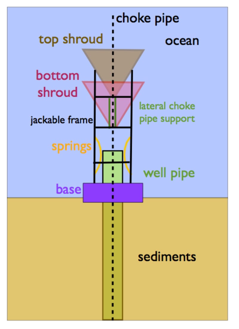 The cylindrical frame supports two conical shrouds above a heavy base. The conical shrouds are rigidly connected together. The base is sufficiently heavy to hold the apparatus on the seabed against the upward pressure of the oil on the lower shroud . The frame is centered on the well with deformable guide springs that engage the pipe so that it can be centered over the well pipe, so permitting insertion of the choke pipe.