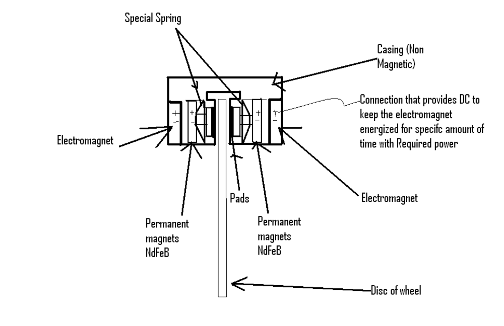 In this project we are using electromagnets to repel the brake pad. The brake pad will be attached to a High Power Permanent Magnet called NdFeB. The electromagnet will be supplied with DC current to drive. The current can be changed to AC by using converters and these brakes can also be used as an ABS (Anti Braking System).