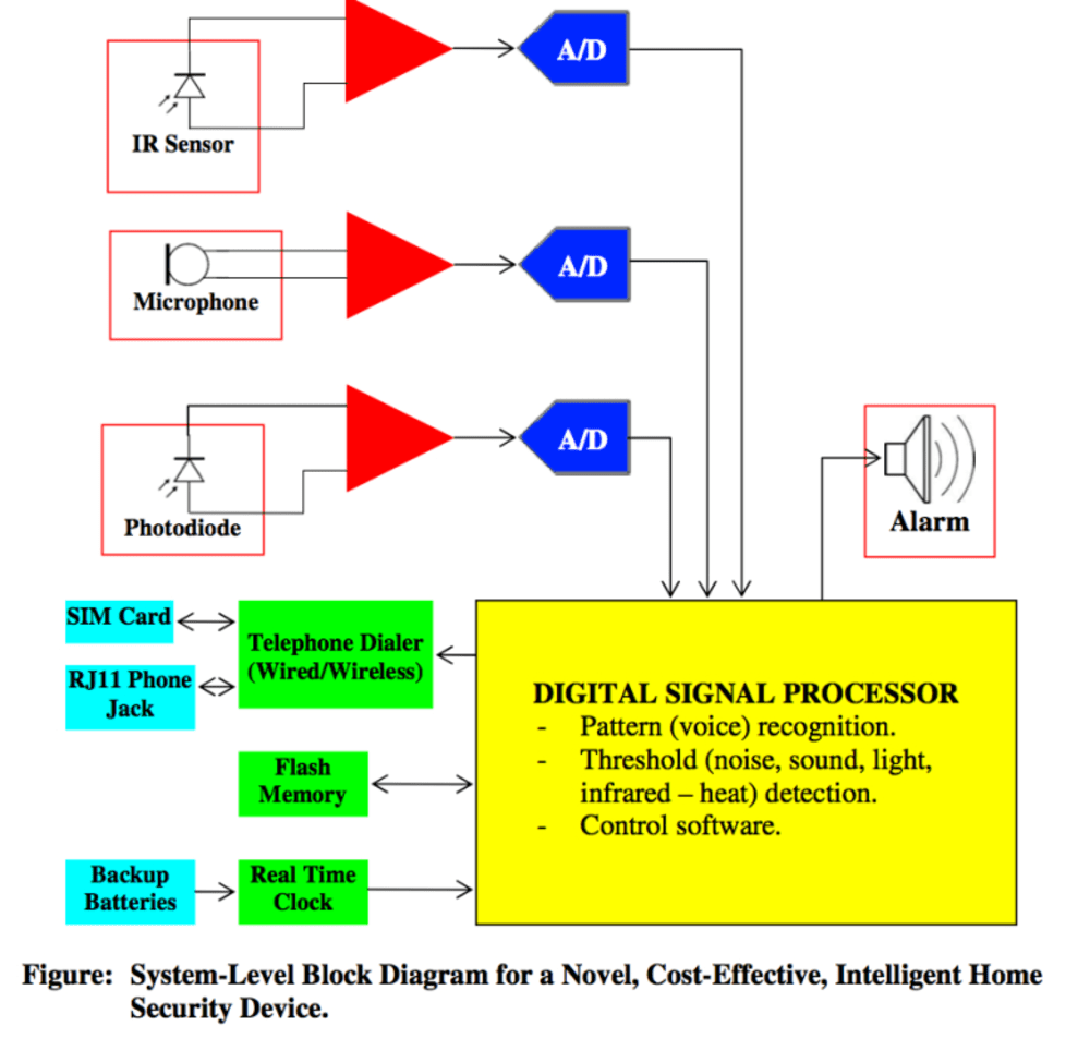 Taking the idea one step further, one can make an intelligent home security robot. With almost the same hardware as above but more sophisticated software, we have the next generation security device. It can take the form of a wall décor, paperweight, or plug-in night light to be discreet. Inside will be a microphone, photodiode, infrared sensor, siren alarm, wired and wireless telephone dialer, real time clock, memory, and DSP (digital signal processor). The device will learn to recognize the family members’ voices, light and sound/noise levels, infrared (indicator of warm bodies), analyze the data, and react appropriately. If you are at home at 6pm and a robber posing as a salesperson forced his way into your home and demand your money, the robot would recognize the strange noise and voice and elevated sound levels and notify the police (current systems would provide no protection in case of an intruder when you are home and the system is disarmed). Similarly, it will react to infrared activities at 2am, sounds of glass breakage, door opening, gun shots and many other distress sounds via sound recognition software and not requiring a sensor at every door or window.