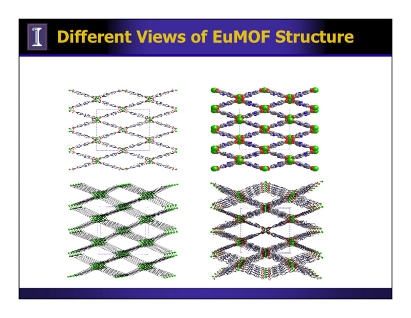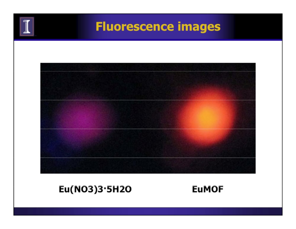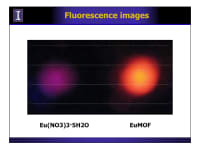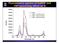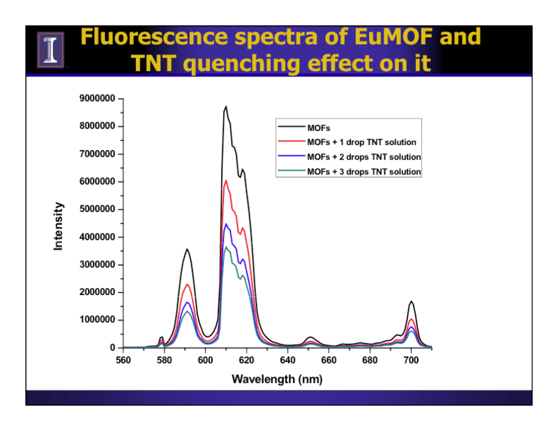 The EuMOF can be obtained easily by solvothermal reaction of the two starting materials, 2, 2’-bipyridine-5, 5’-dicarboxylate acid and Eu(NO3)3?5H2O in DMF for three days. Eu(NO3)3?5H2O itself has weak fluorescence while the EuMOF emits much stronger red light under UV light in solid state at room temperature than Eu(NO3)3?5H2O. For the application of explosives detection, one just needs to sprinkle some EuMOFs over an area – such as battlefield – and shed a UV light onto them to analyze the environment/object. Here a portable fluorometer is needed to detect the fluorescence change. Detection of TNT is achieved by the quenching effect of TNT to EuMOFs. As our test demonstrated, the significant quenching effect will display as soon as EuMOFs are exposed to TNT.