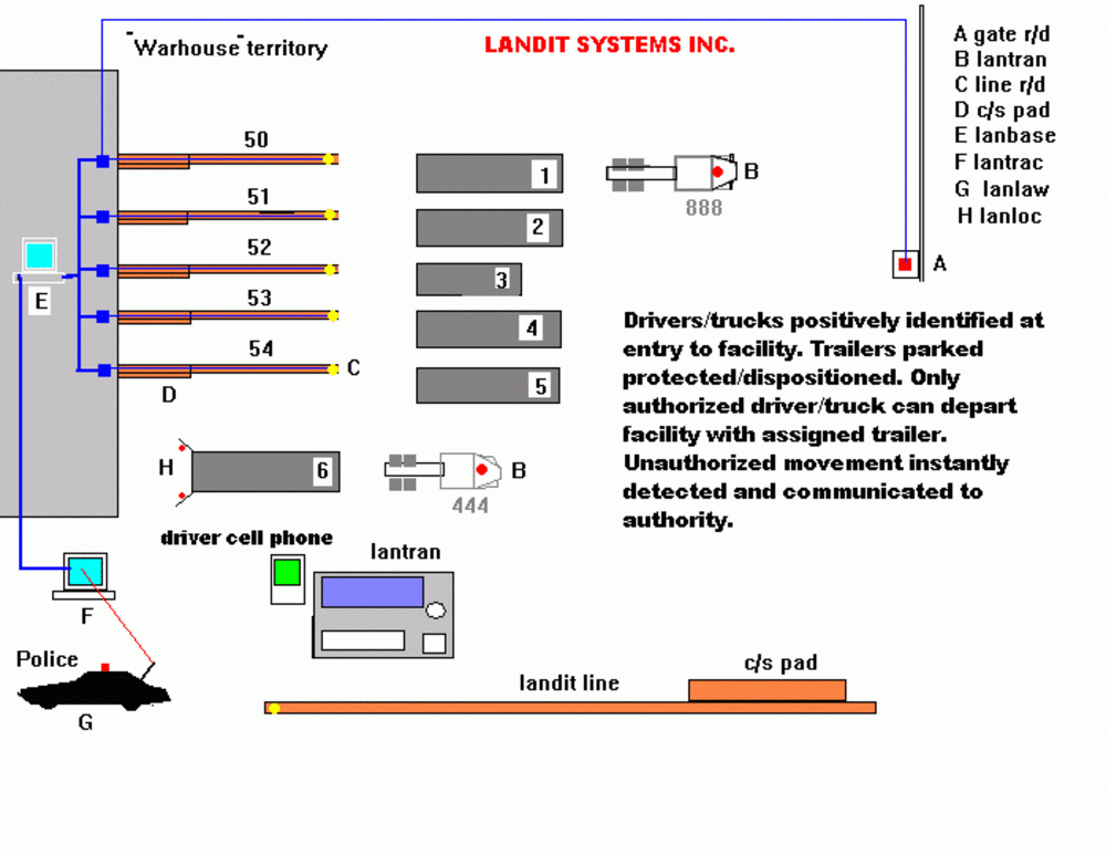 E. GATE R/D - Radio transceiver deployed singular or multiple at entrance to facility. Programmed to detect/read truck deployed programmed Lantran, when truck enters designated area at facility. Communicates programmed Lantran information to facility Lanbase authority initiating facility security and operations programs. If facility is gated, R/D activates gate mechanism, to open gate entry/exit at positive driver/truck identification.