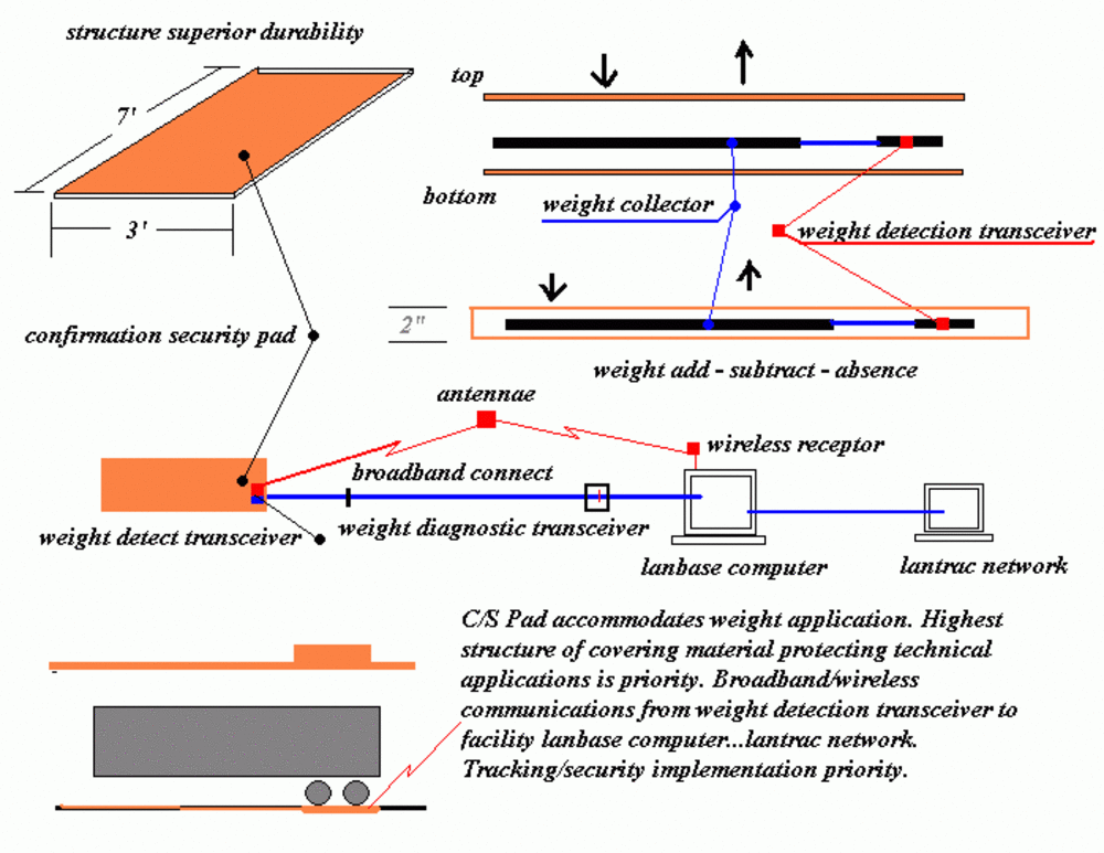 B. CONFIRMATION SECURITY PAD - Trailer/vehicle wheel weight accommodation. Trailer/freight protection at facility. Weight sensor detection pad deployed, hermetically sealed at Landit Line structure, ground level, security programmed to instantly detect classify unauthorized movement at parked trailer, and security and law forces alerted. Don't enter it, don't remove from it, and don't move it, unless authorized.