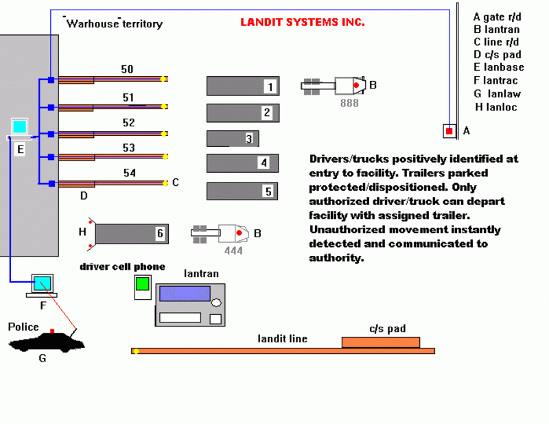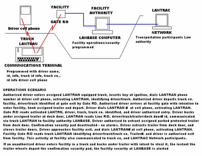 D. LANTRAN COMMUNICATIONS TERMINAL - Pre-programmed/programmable wireless network telecommunications system deployed at truck, with driver name, - driver code# - driver license/photo # - driver social security # - driver cell phone#, - truck co.identification info, - and truck identification info. Priority communication is to identify authorized driver, operating assigned truck, at strategic locations.