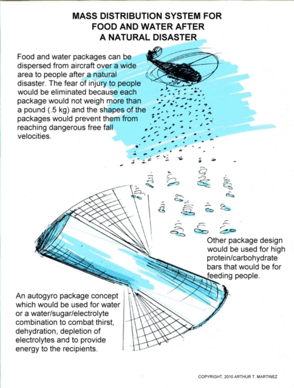 The problem is the length of time that it takes to distribute food and water after a natural disaster. This design solves the problem of the “point source method of food distribution” that I saw after the Haiti earthquake disaster. Point source distribution was eventually used in Port-au-Prince but because of damaged roads it could not be used to access rural areas until many days later.